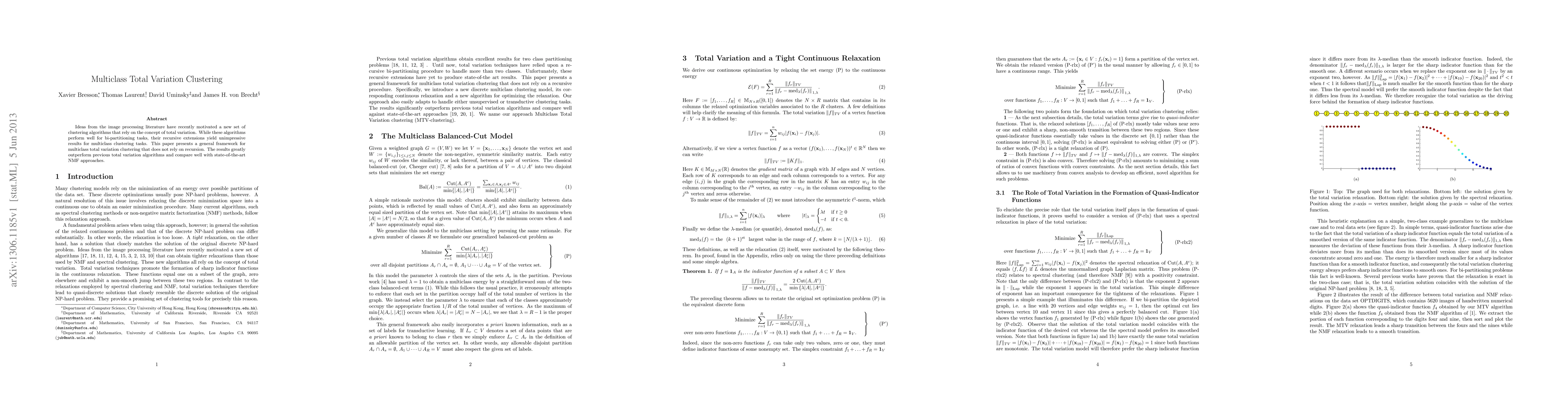 Ideas from the image processing literature have recently motivated a new set of clustering algorithms that rely on the concept of total variation. While these algorithms perform well for bi-partitioning tasks, their recursive extensions yield unimpressive results for multiclass clustering tasks. This paper presents a general framework for multiclass total variation clustering that does not rely on recursion. The results greatly outperform previous total variation algorithms and compare well with state-of-the-art NMF approaches.