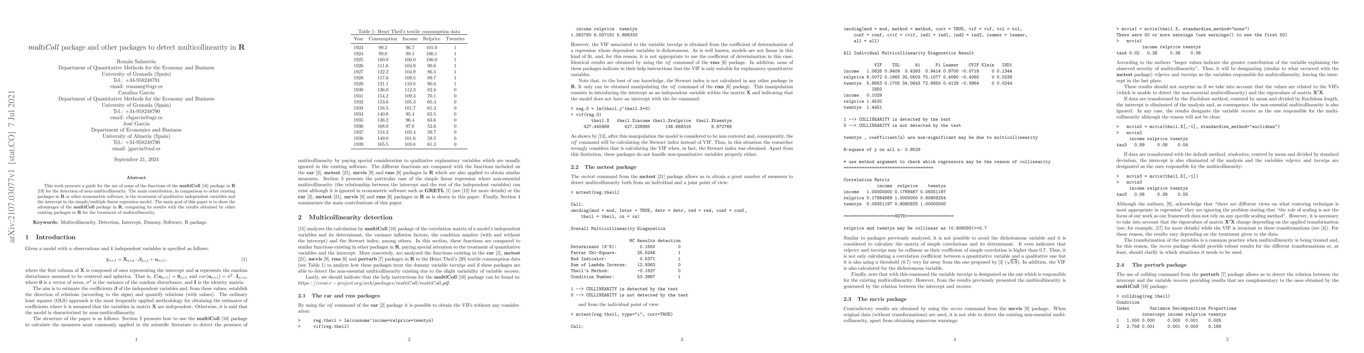 This work presents a guide for the use of some of the functions of the multiColl package in R for the detection of near-multicollinearity. The main contribution, in comparison to other existing packages in R or other econometric software, is the treatment of qualitative independent variables and the intercept in the simple/multiple linear regression model. The main goal of this paper is to show the advantages of the multiColl package in R, comparing its results with the results obtained by other existing packages in R for the treatment of multicollinearity.