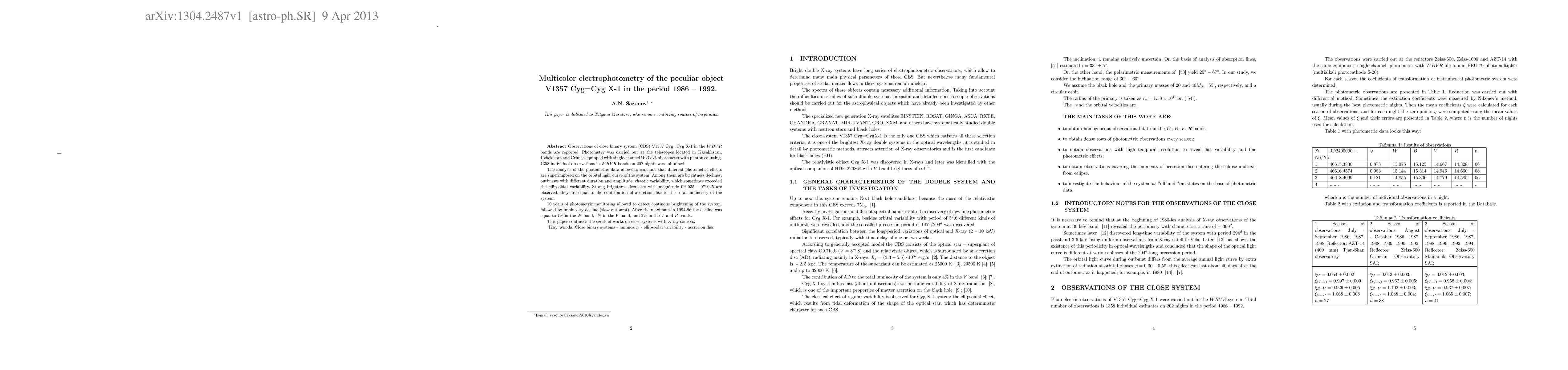 \rm Observations of close binary system (CBS) V1357 Cyg=Cyg X-1 in the $WBVR$ bands are reported. Photometry was carried out at the telescopes located in Kazakhstan, Uzbekistan and Crimea equipped with single-channel $WBVR$-photometer with photon counting. 1358 individual observations in $WBVR$ bands on 202 nights were obtained. The analysis of the photometric data allows to conclude that different photometric effects are superimposed on the orbital light curve of the system. Among them are brightness declines, outbursts with different duration and amplitude, chaotic variability, which sometimes exceeded the ellipsoidal variability. Strong brightness decreases with magnitude $0^m.035 - 0^m.045$ are observed, they are equal to the contribution of accretion disc to the total luminosity of the system. 10 years of photometric monitoring allowed to detect continous brightening of the system, followed by luminosity decline (slow outburst). After the maximum in 1994-96 the decline was equal to 7% in the $W$ band, 4% in the $V$ band, and 2% in the $V$ and $R$ bands. This paper continues the series of works on close systems with X-ray sources. \textbf{Key words}: Close binary systems - luminosity - ellipsoidal variability - accretion disc