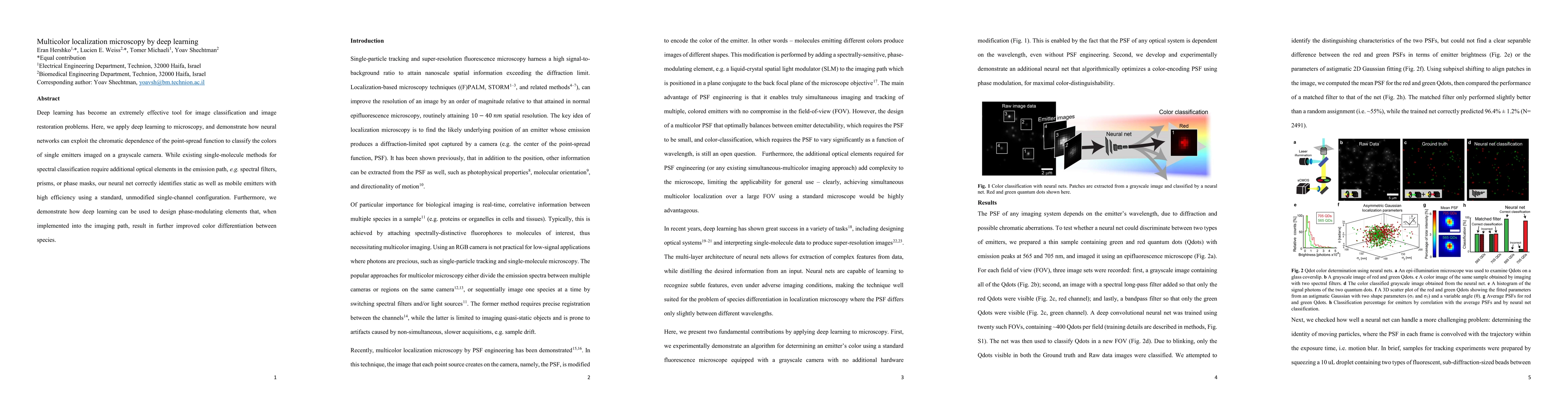 This paper applies deep learning to microscopy to classify colors of single emitters using a standard grayscale camera without additional optical elements, leveraging neural networks to exploit chromatic dependence. The method also demonstrates the use of deep learning to design phase-modulating elements for enhanced color differentiation.