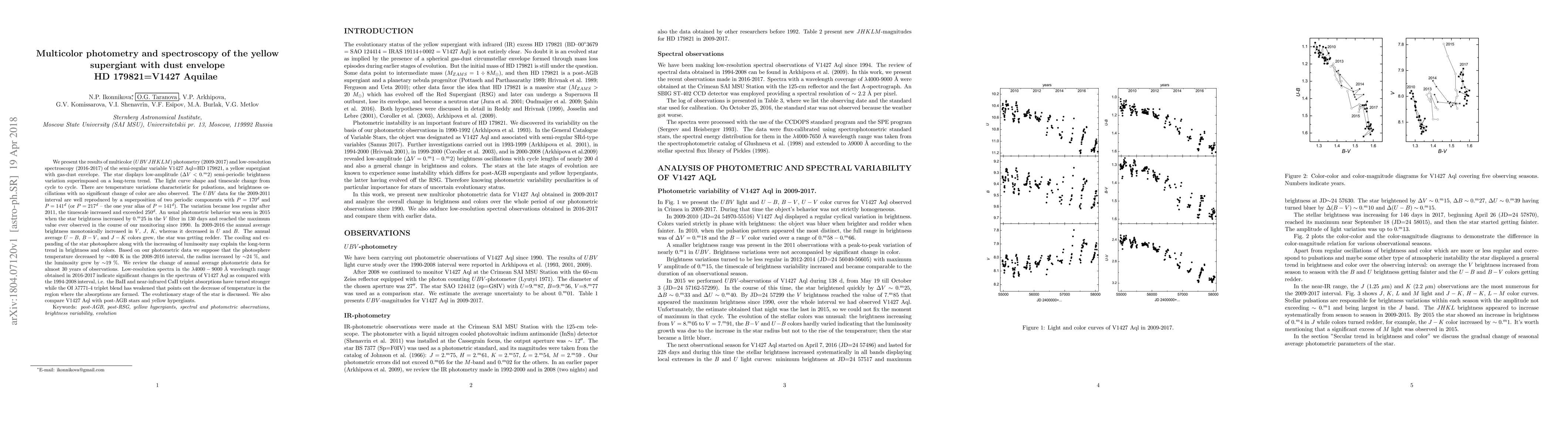 We present the results of multicolor (UBVJHKLM) photometry (2009-2017) and low-resolution spectroscopy (2016-2017) of the semi-regular variable V1427 Aql=HD 179821, a yellow supergiant with gas-dust envelope. The star displays low-amplitude ({\Delta}V<0.2 mag) semi-periodic brightness variation superimposed on a long-term trend. The light curve shape and timescale change from cycle to cycle. There are temperature variations characteristic for pulsations, and brightness oscillations with no significant change of color are also observed. The UBV data for the 2009-2011 interval are well reproduced by a superposition of two periodic components with P=170 d and P=141 d (or P=217 d - the one year alias of P=141 d). The variation became less regular after 2011, the timescale increased and exceeded 250 days. In 2009-2016 the annual average brightness monotonically increased in V, J, K, whereas it decreased in U and B. The annual average U-B, B-V, and J-K colors grew, the star was getting redder. The cooling and expanding of the star photosphere along with the increasing of luminosity may explain the long-term trend in brightness and colors. Based on our photometric data we suppose that the photosphere temperature decreased by ~400 K in the 2008-2016 interval, the radius increased by ~24 %, and the luminosity grew by ~19 %. Low-resolution spectra in the {\lambda}4000-9000 {\AA} wavelength range obtained in 2016-2017 indicate significant changes in the spectrum of V1427 Aql as compared with the 1994-2008 interval, i.e. the BaII and near-infrared CaII triplet absorptions have turned stronger while the OI {\lambda}7771-4 triplet blend has weakened that points out the decrease of temperature in the region where the absorptions are formed. The evolutionary stage of the star is discussed. We also compare V1427 Aql with post-AGB stars and yellow hypergiants.