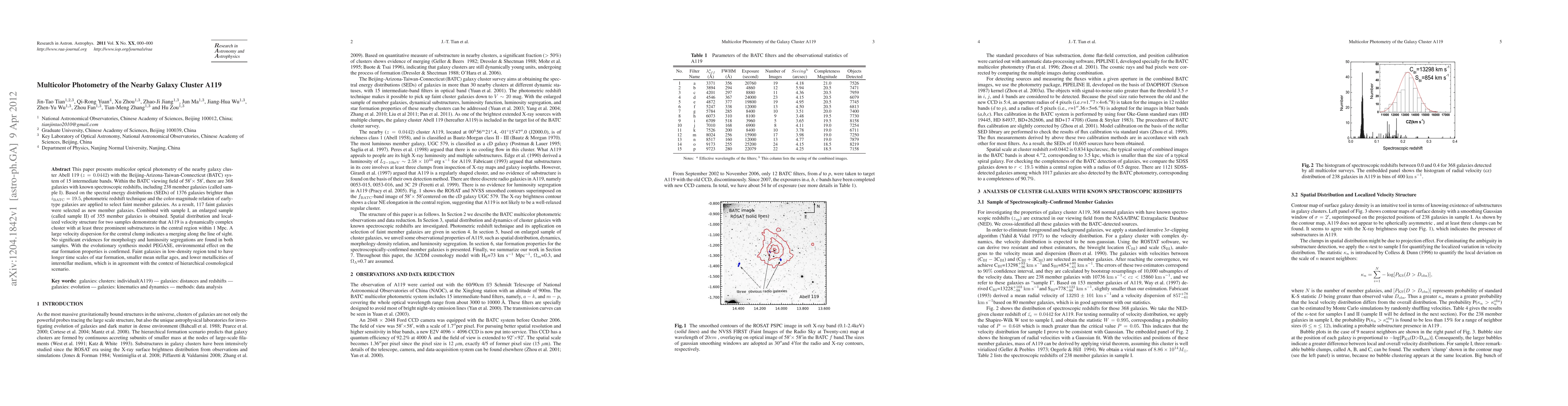 Researchers analyzed a nearby galaxy cluster A119 using multicolor photometry to study its structure and evolution, finding at least three substructures in the central region and evidence of mergers along the line of sight.