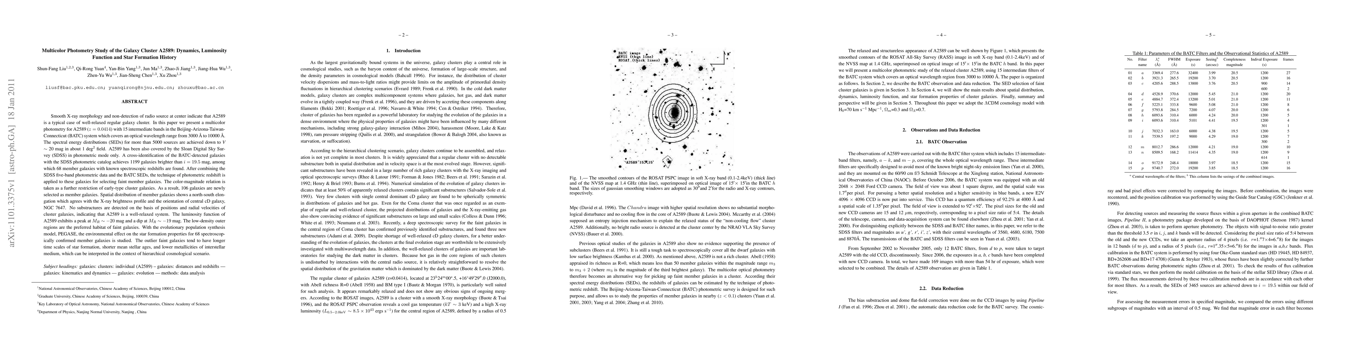 This study uses multicolor photometry in 15 intermediate bands to analyze the galaxy cluster A2589, revealing its dynamics, luminosity function, and star formation history. The analysis identifies 106 member galaxies, showing a relaxed cluster with no substructures, and finds that faint galaxies in low-density regions exhibit longer star formation timescales and lower metallicities, consistent with hierarchical cosmology.
