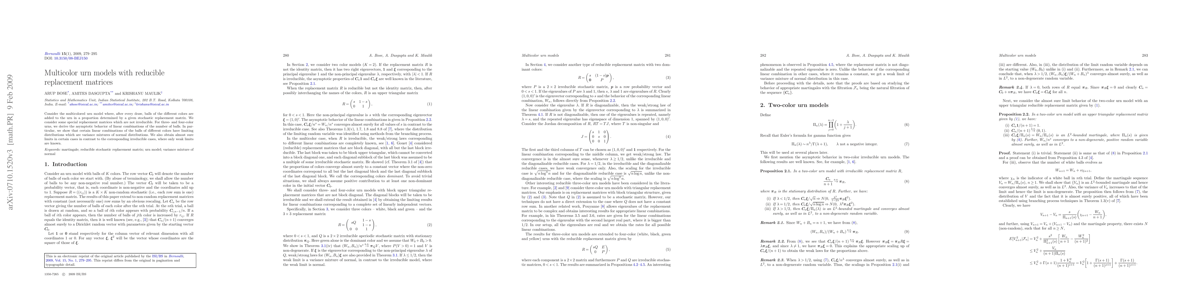 Consider the multicolored urn model where, after every draw, balls of the different colors are added to the urn in a proportion determined by a given stochastic replacement matrix. We consider some special replacement matrices which are not irreducible. For three- and four-color urns, we derive the asymptotic behavior of linear combinations of the number of balls. In particular, we show that certain linear combinations of the balls of different colors have limiting distributions which are variance mixtures of normal distributions. We also obtain almost sure limits in certain cases in contrast to the corresponding irreducible cases, where only weak limits are known.