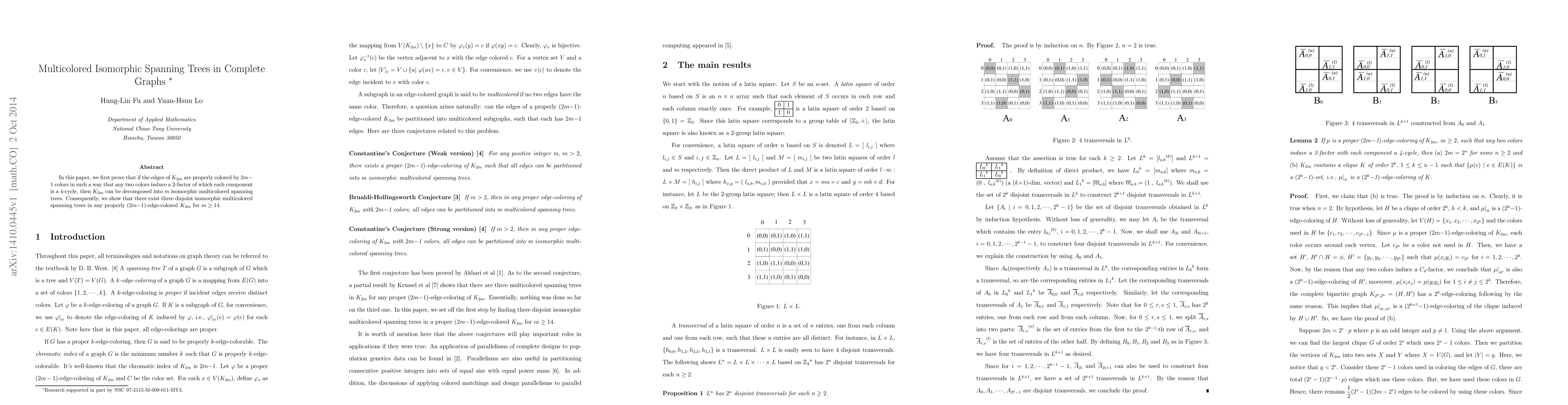 This paper proves that a complete graph $K_{2m}$ with $2m-1$ colors can be decomposed into $m$ isomorphic multicolored spanning trees if each color induces a 2-factor of 4-cycles. It also shows the existence of three disjoint isomorphic multicolored spanning trees in any properly colored $K_{2m}$ for $m\geq 14$.