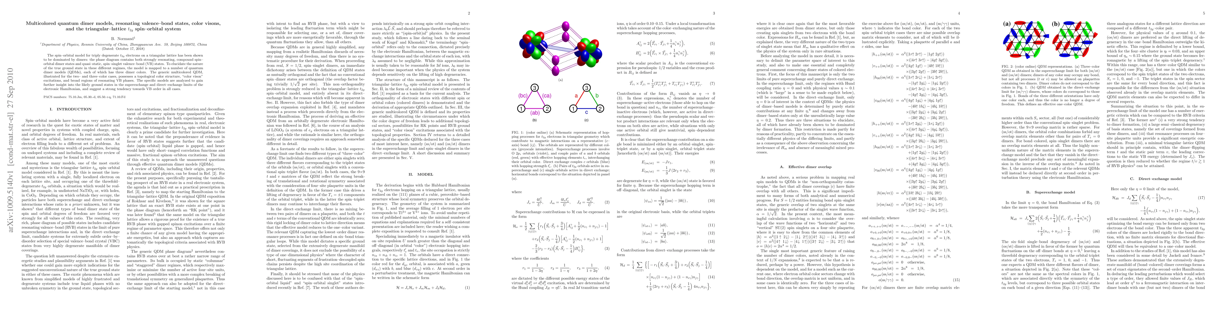 The spin-orbital model for triply degenerate t_2g electrons on a triangular lattice has been shown to be dominated by dimers: the phase diagram contains both strongly resonating, compound spin-orbital dimer states and quasi-static, spin-singlet valence-bond (VB) states. To elucidate the nature of the true ground state in these different regimes, the model is mapped to a number of quantum dimer models (QDMs), each of which has three dimer colors. The generic multicolored QDM, illustrated for the two- and three-color cases, possesses a topological color structure, "color vison" excitations, and broad regions of resonating VB phases. The specific models are analyzed to gain further insight into the likely ground states in the superexchange and direct-exchange limits of the electronic Hamiltonian, and suggest a strong tendency towards VB order in all cases.