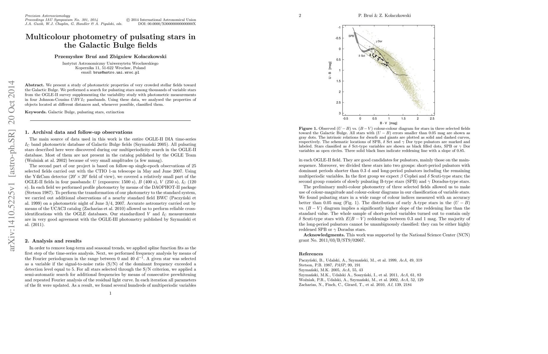 This study investigates the photometric properties of crowded stellar fields in the Galactic Bulge, identifying pulsating stars among thousands of variable stars from the OGLE-II survey using $UBVI_{\rm C}$ passbands. The research classifies these objects based on their distances and properties.