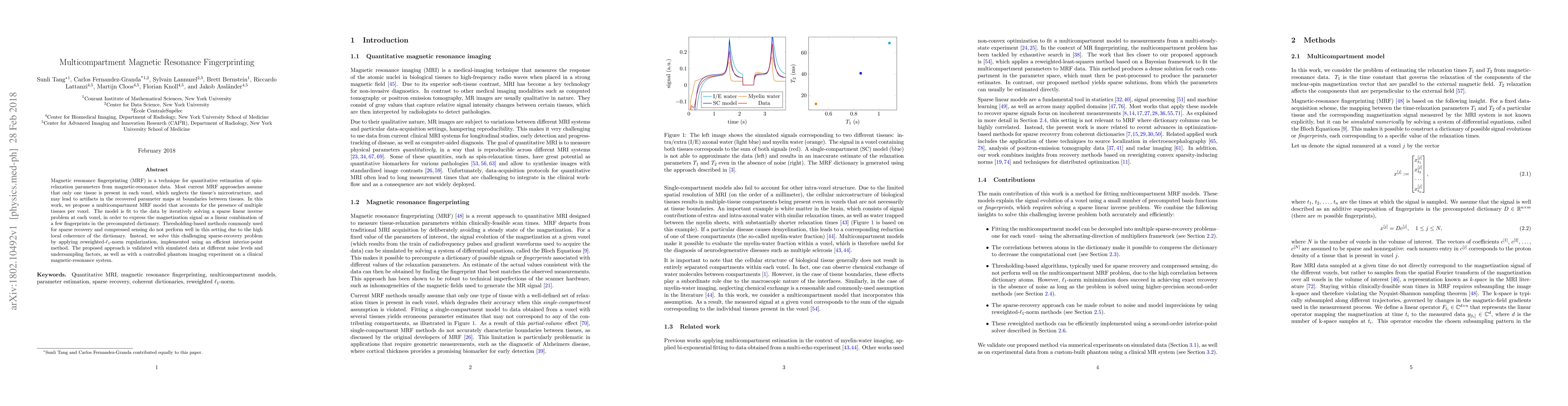This paper proposes a multicompartment magnetic resonance fingerprinting (MRF) model to account for multiple tissues in each voxel, addressing artifacts in parameter maps. It uses reweighted-l1-norm regularization for sparse recovery, validated with simulated data and phantom imaging experiments.