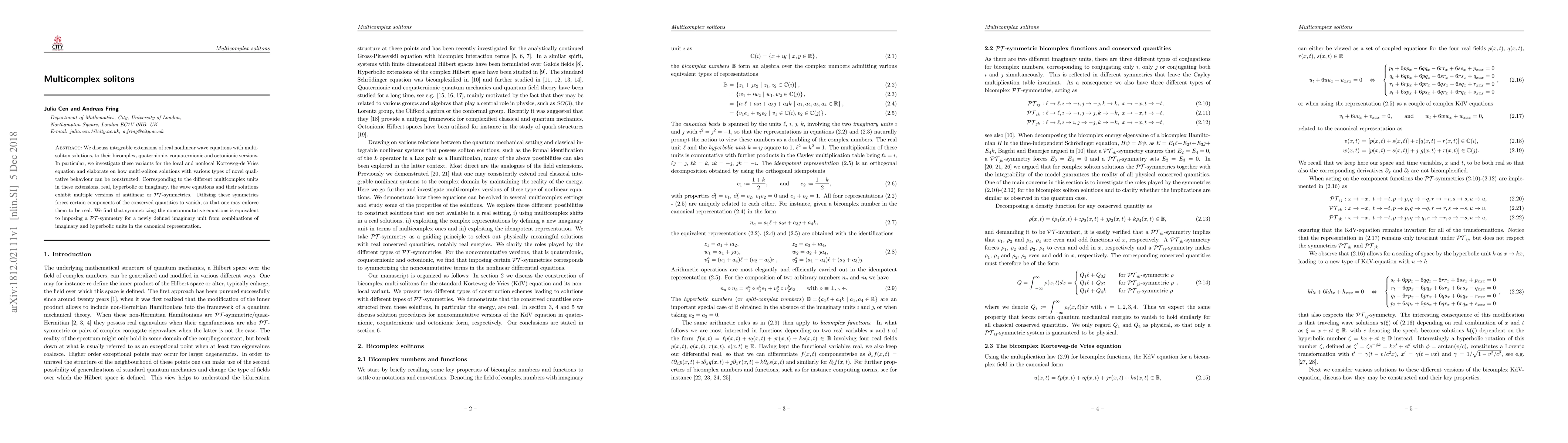 We discuss integrable extensions of real nonlinear wave equations with multi-soliton solutions, to their bicomplex, quaternionic, coquaternionic and octonionic versions. In particular, we investigate these variants for the local and nonlocal Korteweg-de Vries equation and elaborate on how multi-soliton solutions with various types of novel qualitative behaviour can be constructed. Corresponding to the different multicomplex units in these extensions, real, hyperbolic or imaginary, the wave equations and their solutions exhibit multiple versions of antilinear or $\mathcal{PT}$-symmetries. Utilizing these symmetries forces certain components of the conserved quantities to vanish, so that one may enforce them to be real. We find that symmetrizing the noncommutative equations is equivalent to imposing a $\mathcal{PT}$-symmetry for a newly defined imaginary unit from combinations of imaginary and hyperbolic units in the canonical representation.