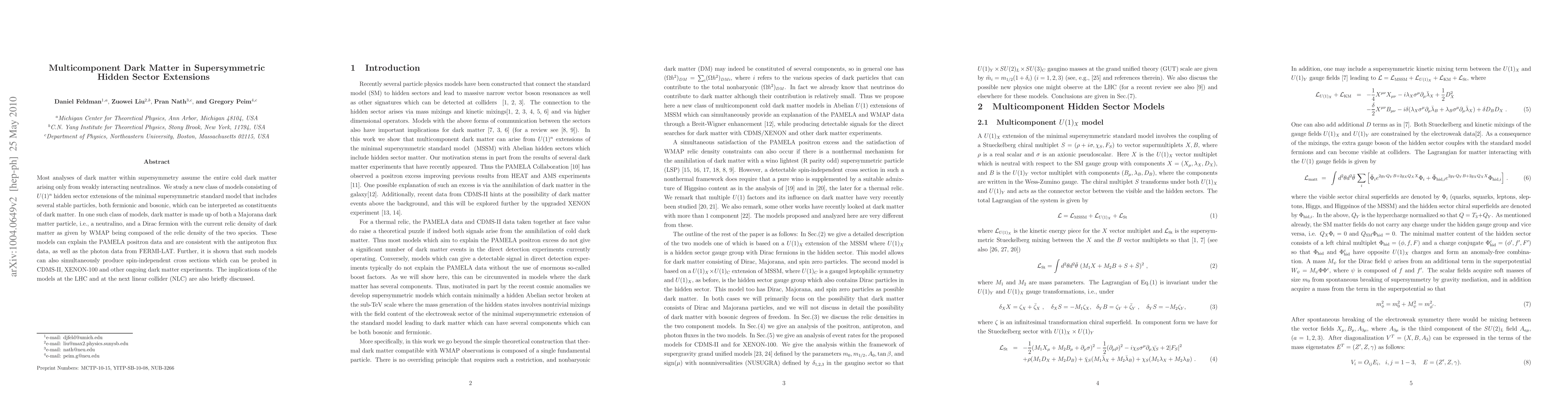 Most analyses of dark matter within supersymmetry assume the entire cold dark matter arising only from weakly interacting neutralinos. We study a new class of models consisting of $U(1)^n$ hidden sector extensions of the MSSM that includes several stable particles, both fermionic and bosonic, which can be interpreted as constituents of dark matter. In one such class of models, dark matter is made up of both a Majorana dark matter particle, i.e., a neutralino, and a Dirac fermion with the current relic density of dark matter as given by WMAP being composed of the relic density of the two species. These models can explain the PAMELA positron data and are consistent with the anti-proton flux data, as well as the photon data from FERMI-LAT. Further, it is shown that such models can also simultaneously produce spin independent cross sections which can be probed in CDMS-II, XENON-100 and other ongoing dark matter experiments. The implications of the models at the LHC and at the NLC are also briefly discussed.
