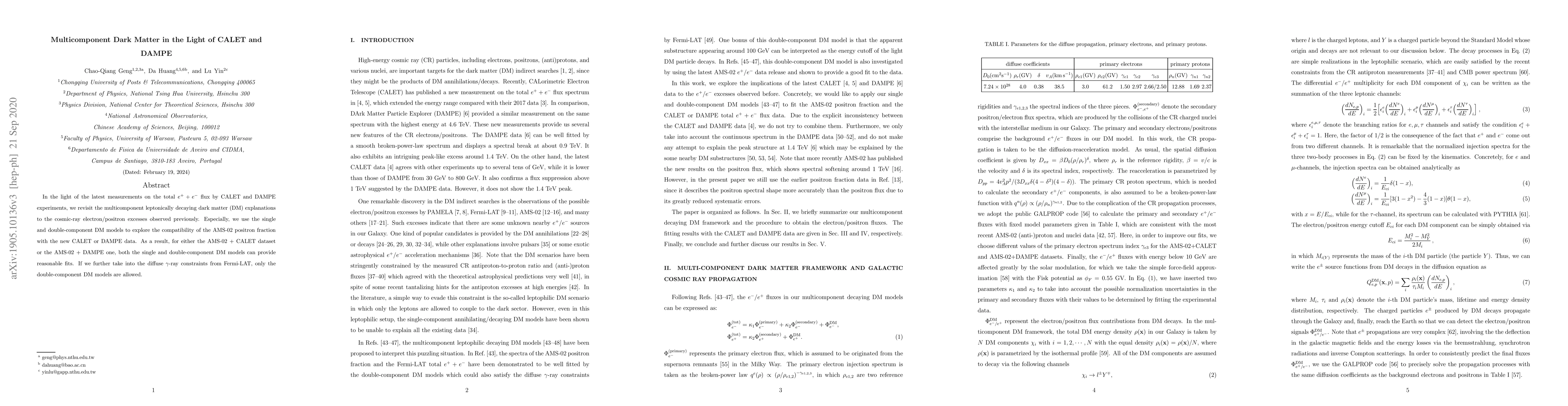 In the light of the latest measurements on the total $e^+ + e^-$ flux by CALET and DAMPE experiments, we revisit the multicomponent leptonically decaying dark matter (DM) explanations to the cosmic-ray electron/positron excesses observed previously. Especially, we use the single and double-component DM models to explore the compatibility of the AMS-02 positron fraction with the new CALET or DAMPE data. It turns out that neither single nor double-component DM models are able to fit the AMS-02 positron fraction and DAMPE total $e^+ + e^-$ flux data simultaneously. On the other hand, for the combined AMS-02 and CALET dataset, both the single and double-component DM models can provide reasonable fits. If we further take into the diffuse $\gamma$-ray constraints from Fermi-LAT, only the double-component DM models are allowed.