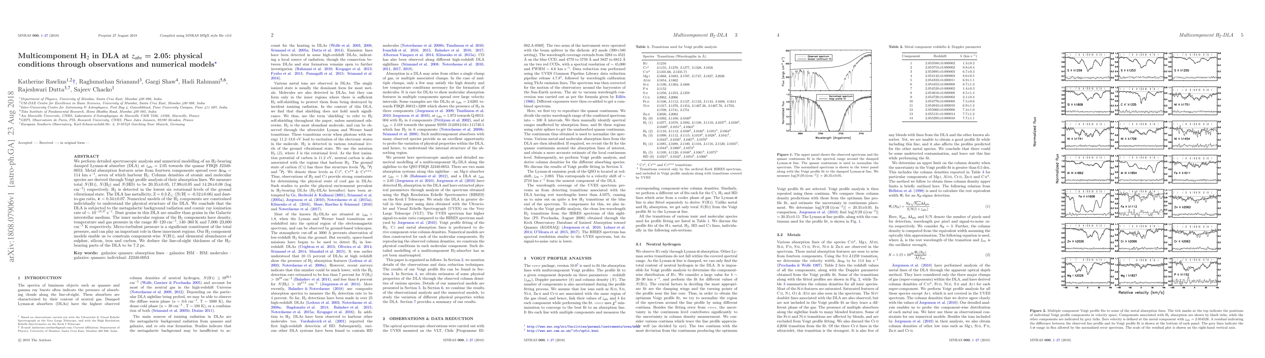 We perform detailed spectroscopic analysis and numerical modelling of an H2-bearing damped Lyman-alpha absorber (DLA) at zabs = 2.05 towards the quasar FBQS J2340-0053. Metal absorption features arise from fourteen components spread over $\Delta v_{90}$ = 114 km s$^{-1}$, seven of which harbour H2. Column densities of atomic and molecular species are derived through Voigt profile analysis of their absorption lines. We measure total N(H I), N(H2) and N(HD) to be 20.35+/-0.05, 17.99+/-0.05 and 14.28+/-0.08 (log cm$^{-2}$) respectively. H2 is detected in the lowest six rotational levels of the ground vibrational state. The DLA has metallicity, Z = 0.3 Z$_\sun$ ([S/H] = -0.52+/-0.06) and dust-to-gas ratio, $\kappa$ = 0.34+/-0.07. Numerical models of the H2 components are constrained individually to understand the physical structure of the DLA. We conclude that the DLA is subjected to the metagalactic background radiation and cosmic ray ionization rate of $\sim$ 10$^{-15.37}$ s$^{-1}$. Dust grains in this DLA are smaller than grains in the Galactic interstellar medium. The inner molecular regions of the H2 components have density, temperature and gas pressure in the range 30-120 cm$^{-3}$, 140-360 K and 7,000-23,000 cm$^{-3}$ K respectively. Micro-turbulent pressure is a significant constituent of the total pressure, and can play an important role in these innermost regions. Our H2 component models enable us to constrain component-wise N(H I), and elemental abundances of sulphur, silicon, iron and carbon. We deduce the line-of-sight thickness of the H2-bearing parts of the DLA to be 7.2 pc.