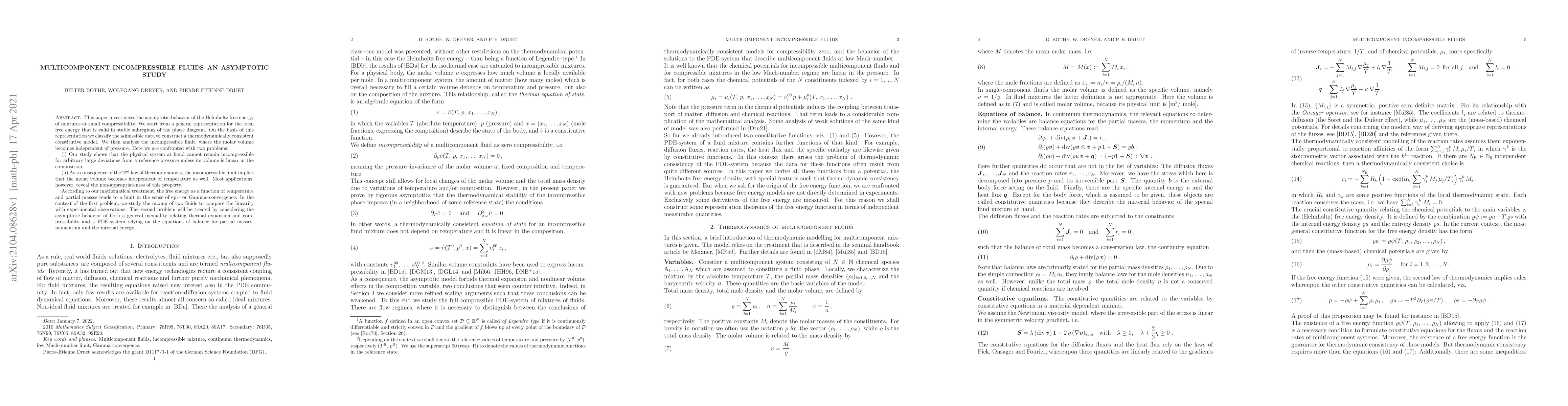 This paper investigates the asymptotic behavior of the Helmholtz free energy of mixtures at small compressibility. We start from a general representation for the local free energy that is valid in stable subregions of the phase diagram. On the basis of this representation we classify the admissible data to construct a thermodynamically consistent constitutive model. We then analyze the incompressible limit, where the molar volume becomes independent of pressure. Here we are confronted with two problems: (i) Our study shows that the physical system at hand cannot remain incompressible for arbitrary large deviations from a reference pressure unless its volume is linear in the composition. (ii) As a consequence of the second law of thermodynamics, the incompressible limit implies that the molar volume becomes independent of temperature as well. Most applications, however, reveal the non-appropriateness of this property. According to our mathematical treatment, the free energy as a function of temperature and partial masses tends to a limit in the sense of epi- or Gamma-convergence. In the context of the first problem, we study the mixing of two fluids to compare the linearity with experimental observations. The second problem will be treated by considering the asymptotic behavior of both a general inequality relating thermal expansion and compressibility and a PDE-system relying on the equations of balance for partial masses, momentum and the internal energy.