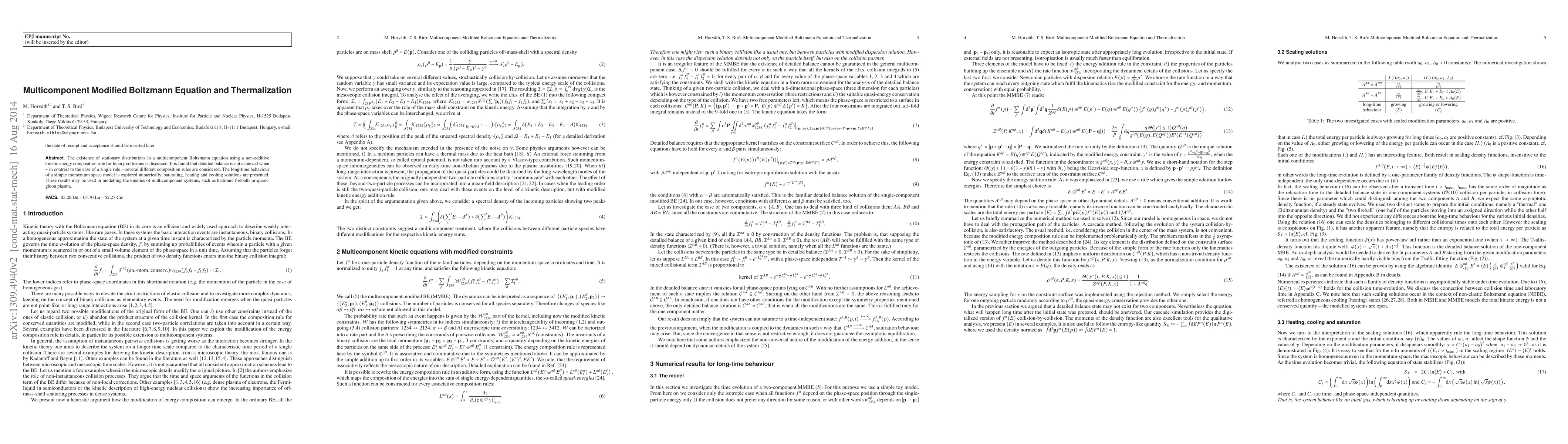 This paper explores stationary distributions in a multicomponent modified Boltzmann equation with non-additive kinetic energy rules for binary collisions, finding that detailed balance fails when multiple rules are used. Numerical simulations of a simple momentum space model reveal saturating, heating, and cooling solutions.