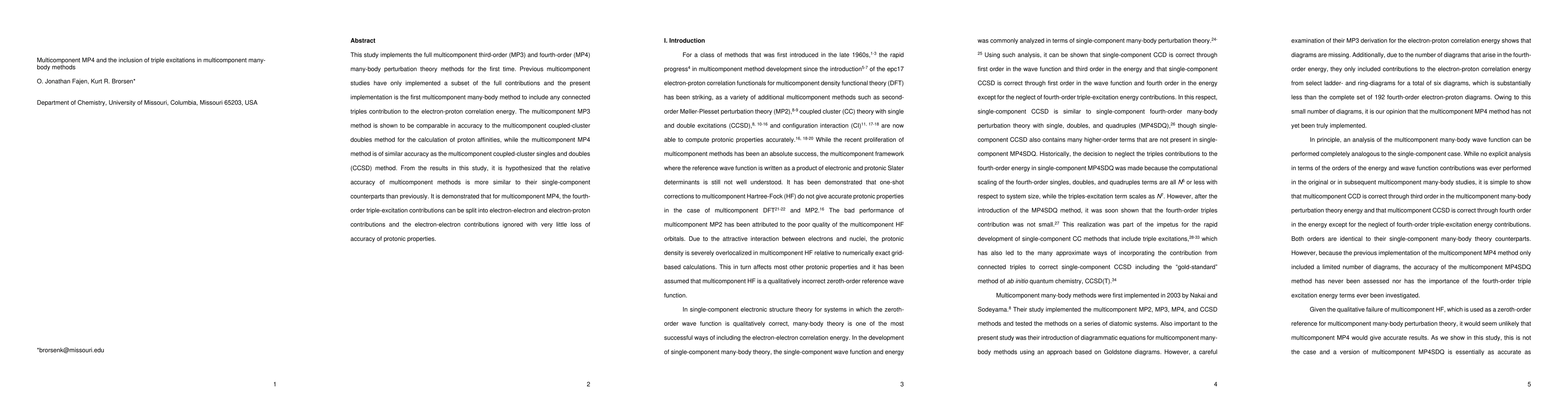 This paper introduces the full multicomponent third-order (MP3) and fourth-order (MP4) many-body perturbation theory methods, including triple excitations for the first time. The study finds that multicomponent MP3 and MP4 are comparable in accuracy to multicomponent CCSD and suggests that the relative accuracy of multicomponent methods aligns more closely with their single-component counterparts.