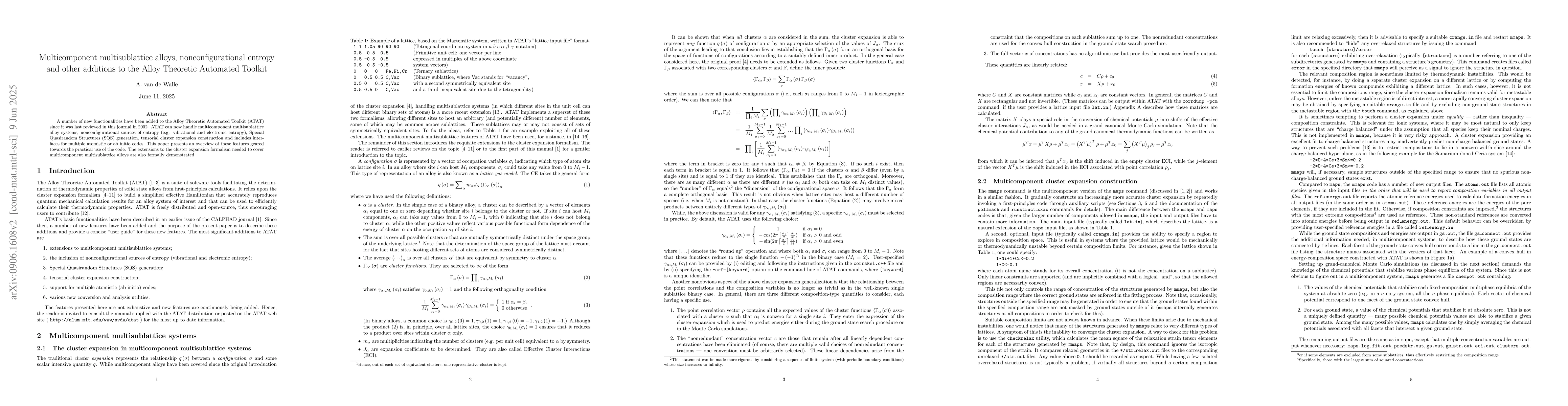 This paper introduces new functionalities to the Alloy Theoretic Automated Toolkit (ATAT), including support for multicomponent multisublattice alloys and nonconfigurational entropy sources. It also details enhancements like Special Quasirandom Structures generation and interfaces for various atomistic codes.