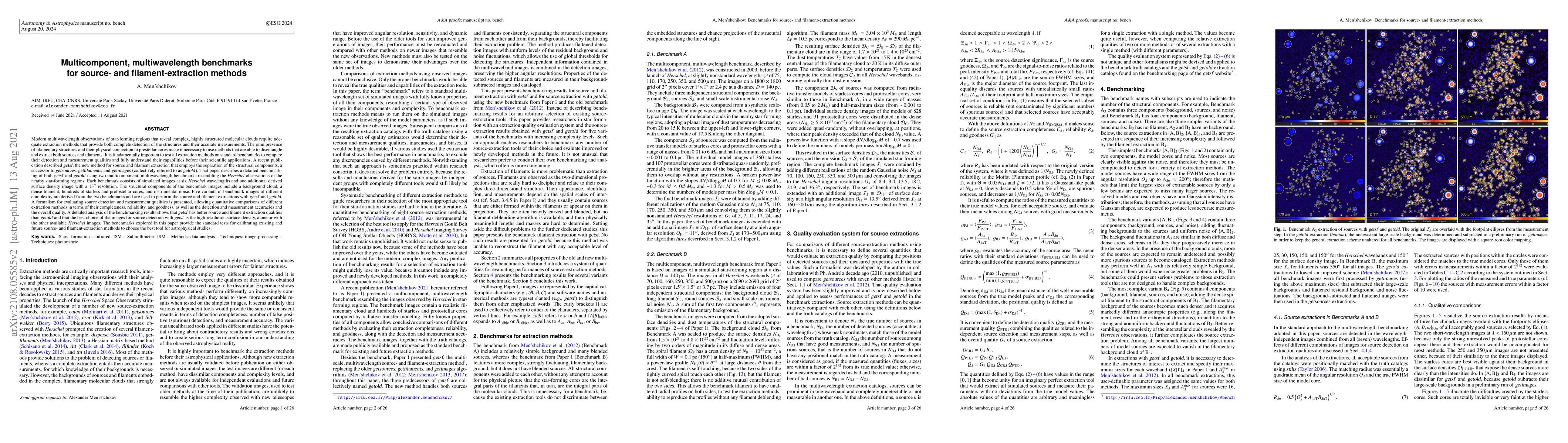 This research benchmarks two source and filament extraction methods, getsf and getold, using multicomponent, multiwavelength synthetic images resembling Herschel observations of nearby star-forming regions. The benchmarks include structural components like a background cloud, dense filaments, and hundreds of starless and protostellar cores, along with instrumental noise.