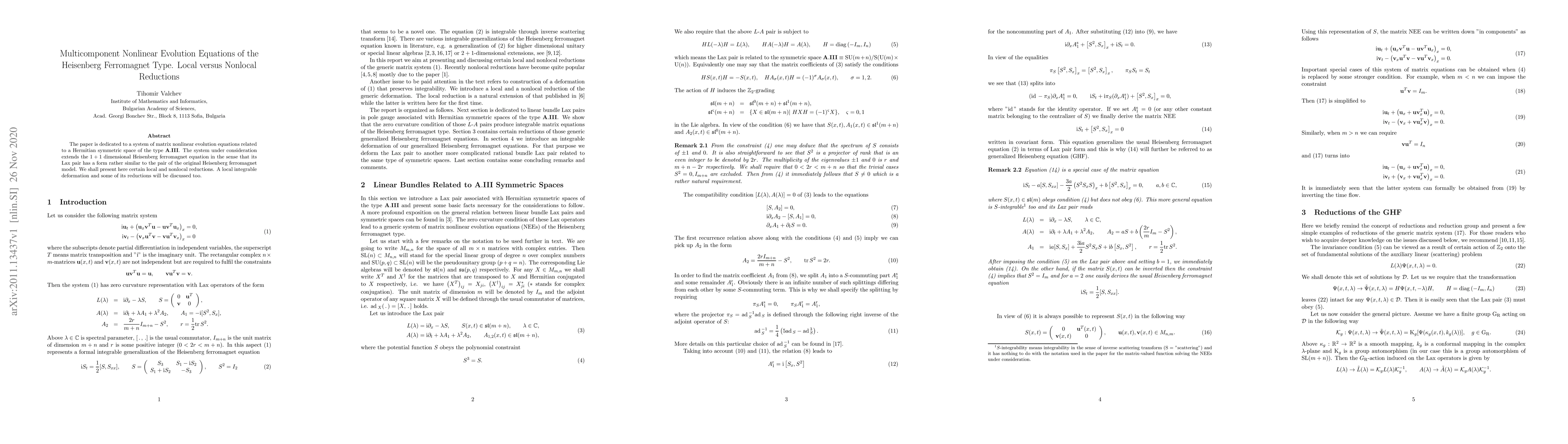 The paper is dedicated to a system of matrix nonlinear evolution equations related to a Hermitian symmetric space of the type $\mathbf{A.III}$. The system under consideration extends the $1+1$ dimensional Heisenberg ferromagnet equation in the sense that its Lax pair has a form rather similar to the pair of the original Heisenberg ferromagnet model. We shall present here certain local and nonlocal reductions. A local integrable deformation and some of its reductions will be discussed too.