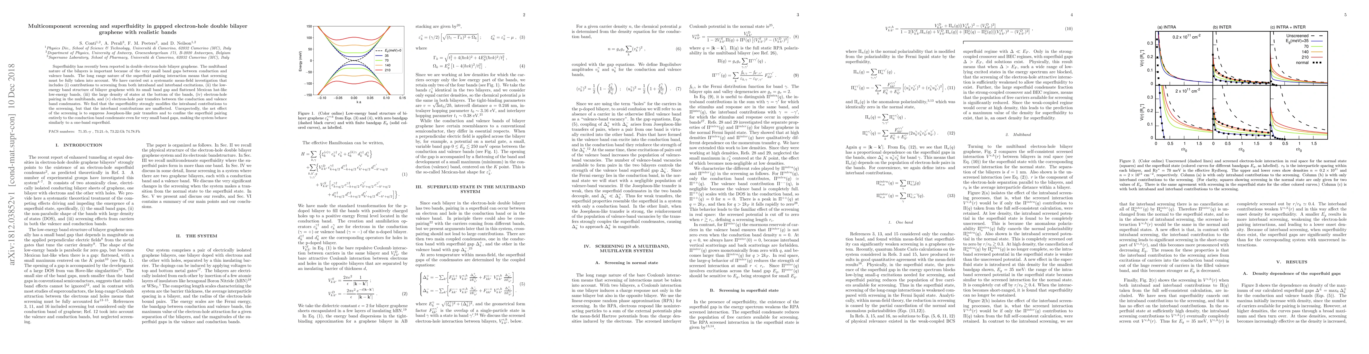 Superfluidity has recently been reported in double electron-hole bilayer graphene. The multiband nature of the bilayers is important because of the very small band gaps between conduction and valence bands. The long range nature of the superfluid pairing interaction means that screening must be fully taken into account. We have carried out a systematic mean-field investigation that includes (i) contributions to screening from both intraband and interband excitations, (ii) the low-energy band structure of bilayer graphene with its small band gap and flattened Mexican hat-like low-energy bands, (iii) the large density of states at the bottom of the bands, (iv) electron-hole pairing in the multibands, and (v) electron-hole pair transfers between the conduction and valence band condensates. We find that the superfluidity strongly modifies the intraband contributions to the screening, but that the interband contributions are unaffected. Unexpectedly, the net effect of the screening is to suppress Josephson-like pair transfers and to confine the superfluid pairing entirely to the conduction band condensate even for very small band gaps, making the system behave similarly to a one-band superfluid.