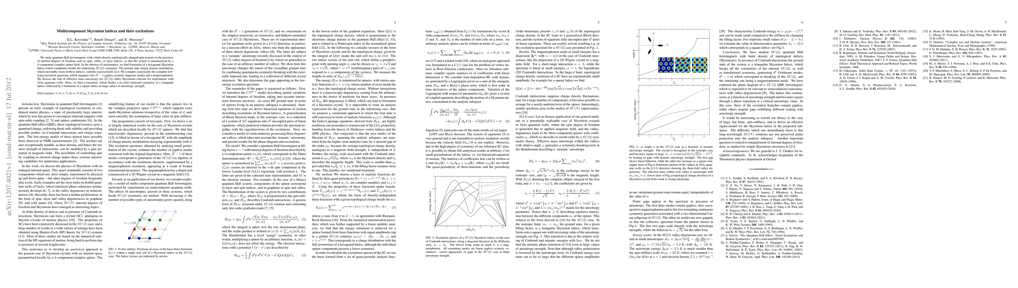 We study quantum Hall ferromagnets with a finite density topologically charged spin textures in the presence of internal degrees of freedom such as spin, valley, or layer indices, so that the system is parametrised by a $d$-component complex spinor field. In the absence of anisotropies, we find formation of a hexagonal Skyrmion lattice which completely breaks the underlying SU(d) symmetry. The ground state charge density modulation, which inevitably exists in these lattices, vanishes exponentially in $d$. We compute analytically the complete low-lying excitation spectrum, which separates into $d^{2}-1$ gapless acoustic magnetic modes and a magnetophonon. We discuss the role of effective mass anisotropy for SU(3)-valley Skyrmions relevant for experiments with AlAs quantum wells. Here, we find a transition, which breaks a six-fold rotational symmetry of a triangular lattice, followed by a formation of a square lattice at large values of anisotropy strength.