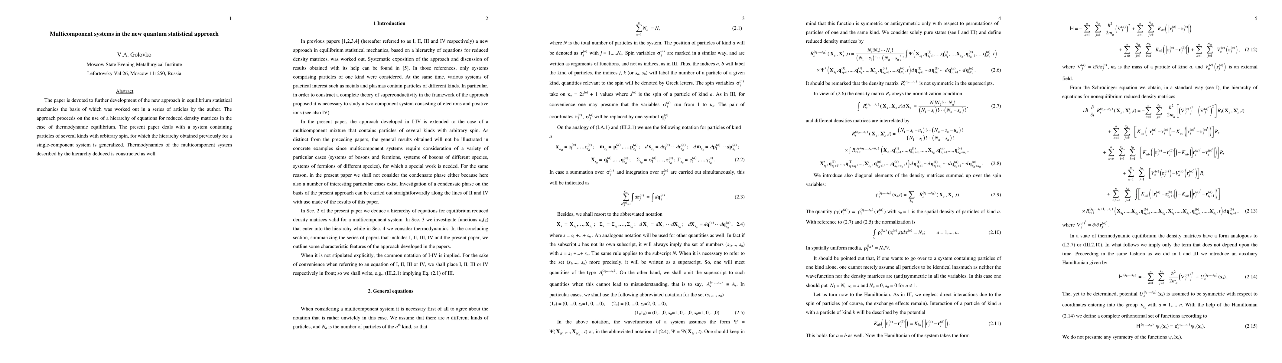 The paper is devoted to further development of the new approach in equilibrium statistical mechanics the basis of which was worked out in a series of articles by the author. The approach proceeds on the use of a hierarchy of equations for reduced density matrices in the case of thermodynamic equilibrium. The present paper deals with a system containing particles of several kinds with arbitrary spin, for which the hierarchy obtained previously for a single-component system is generalized. Thermodynamics of the multicomponent system described by the hierarchy deduced is constructed as well.
