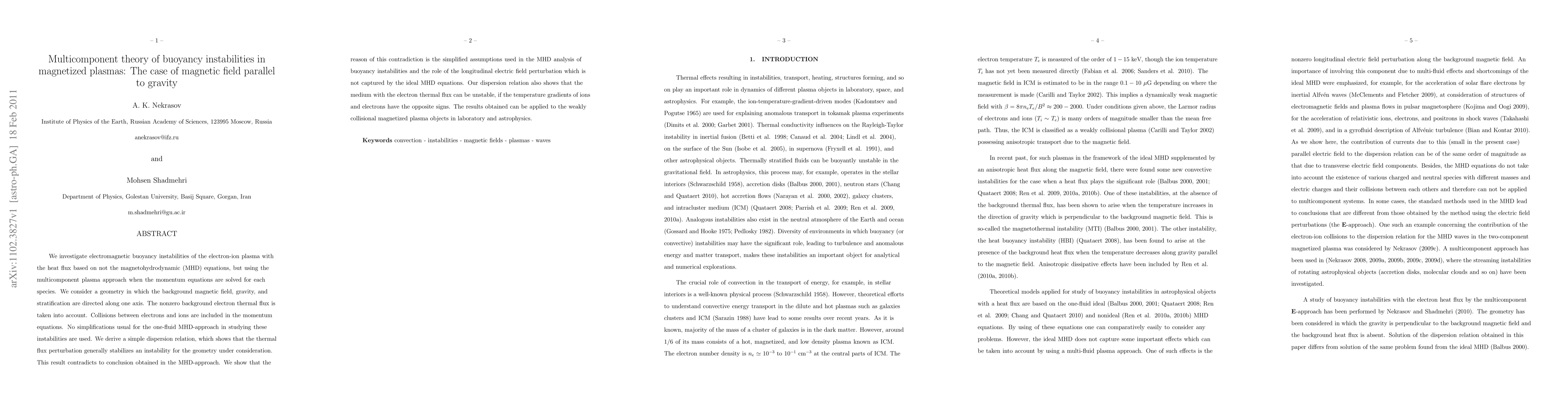 This study explores electromagnetic buoyancy instabilities in electron-ion plasmas using a multicomponent approach, revealing that thermal flux perturbations can stabilize instabilities contrary to MHD predictions. The analysis highlights the importance of longitudinal electric field perturbations and the role of differing temperature gradients between ions and electrons.