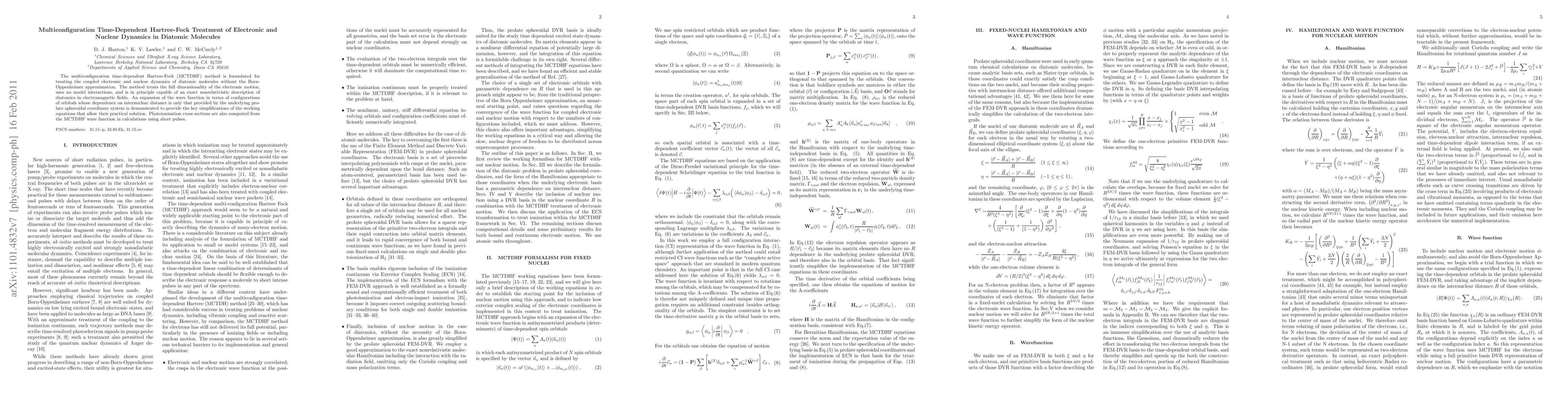 The multiconfiguration time-dependent Hartree-Fock (MCTDHF) method is formulated for treating the coupled electronic and nuclear dynamics of diatomic molecules without the Born- Oppenheimer approximation. The method treats the full dimensionality of the electronic motion, uses no model interactions, and is in principle capable of an exact nonrelativistic description of diatomics in electromagnetic fields. An expansion of the wave function in terms of configurations of orbitals whose dependence on internuclear distance is only that provided by the underlying prolate spheroidal coordinate system is demonstrated to provide the key simplifications of the working equations that allow their practical solution. Photoionization cross sections are also computed from the MCTDHF wave function in calculations using short pulses.