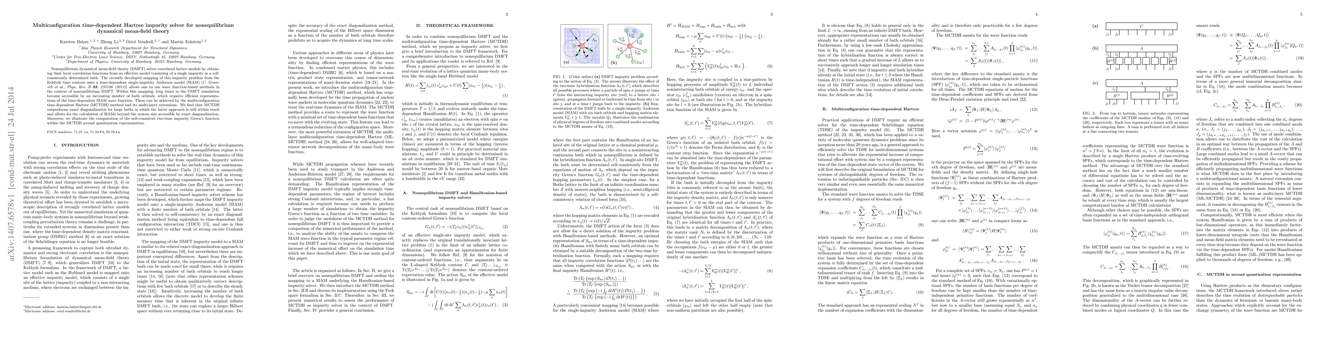 This paper introduces a multiconfiguration time-dependent Hartree (MCTDH) solver for nonequilibrium dynamical mean-field theory (DMFT), demonstrating its efficiency over exact diagonalization for large impurity baths. The MCTDH method enables the computation of larger systems beyond the limits of exact diagonalization.