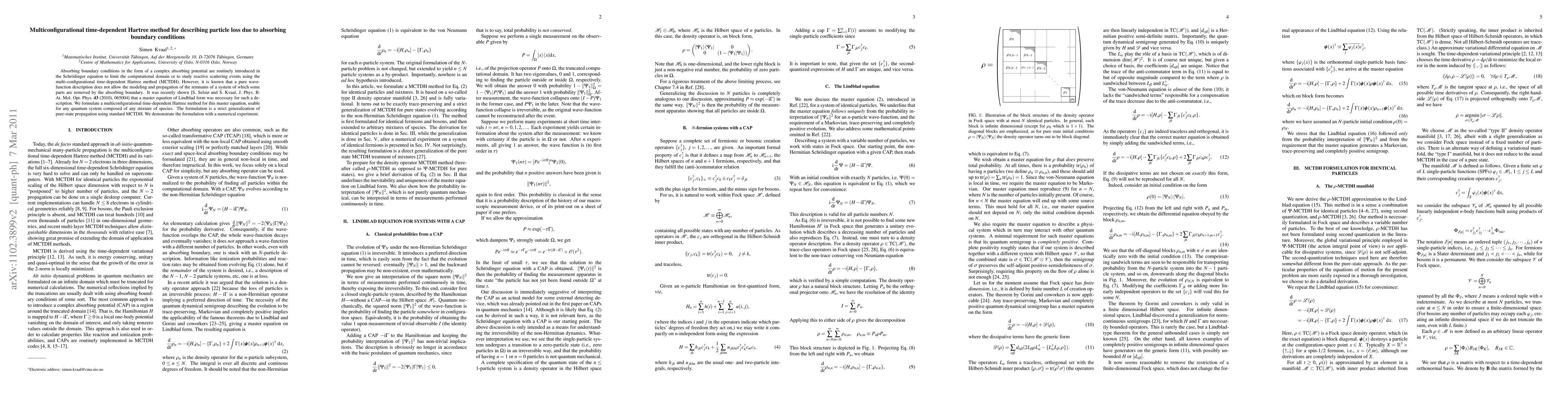 Absorbing boundary conditions in the form of a complex absorbing potential are routinely introduced in the Schr\"odinger equation to limit the computational domain or to study reactive scattering events using the multi-configurational time-dependent Hartree method (MCTDH). However, it is known that a pure wave-function description does not allow the modeling and propagation of the remnants of a system of which some parts are removed by the absorbing boundary. It was recently shown [S. Selst{\o} and S. Kvaal, J. Phys. B: At. Mol. Opt. Phys. {\bfseries 43} (2010), 065004] that a master equation of Lindblad form was necessary for such a description. We formulate a multiconfigurational time-dependent Hartree method for this master equation, usable for any quantum system composed of any mixture of species. The formulation is a strict generalization of pure-state propagation using standard MCTDH. We demonstrate the formulation with a numerical experiment.