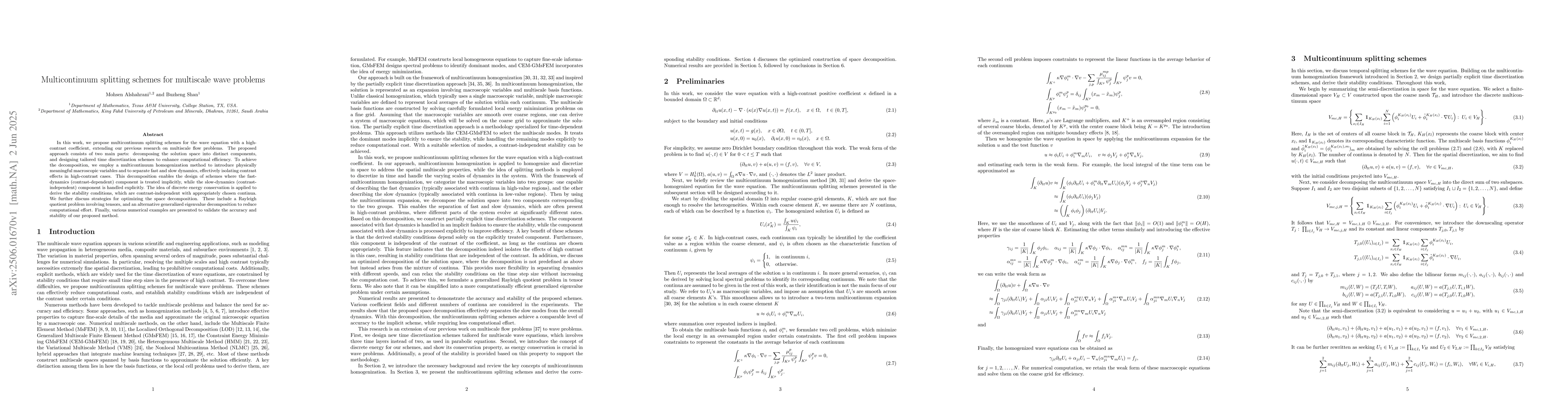 Researchers propose a new method for solving wave equations with high-contrast coefficients, using a multicontinuum splitting scheme that separates fast and slow dynamics to improve computational efficiency and accuracy.
