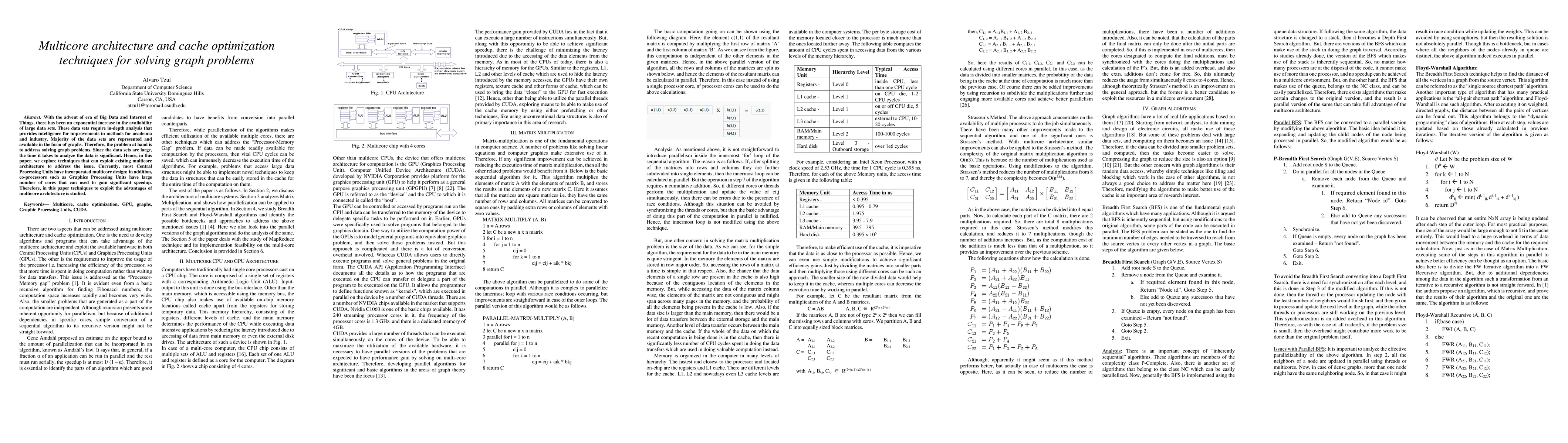 With the advent of era of Big Data and Internet of Things, there has been an exponential increase in the availability of large data sets. These data sets require in-depth analysis that provides intelligence for improvements in methods for academia and industry. Majority of the data sets are represented and available in the form of graphs. Therefore, the problem at hand is to address solving graph problems. Since the data sets are large, the time it takes to analyze the data is significant. Hence, in this paper, we explore techniques that can exploit existing multicore architecture to address the issue. Currently, most Central Processing Units have incorporated multicore design; in addition, co-processors such as Graphics Processing Units have large number of cores that can used to gain significant speedup. Therefore, in this paper techniques to exploit the advantages of multicore architecture is studied.