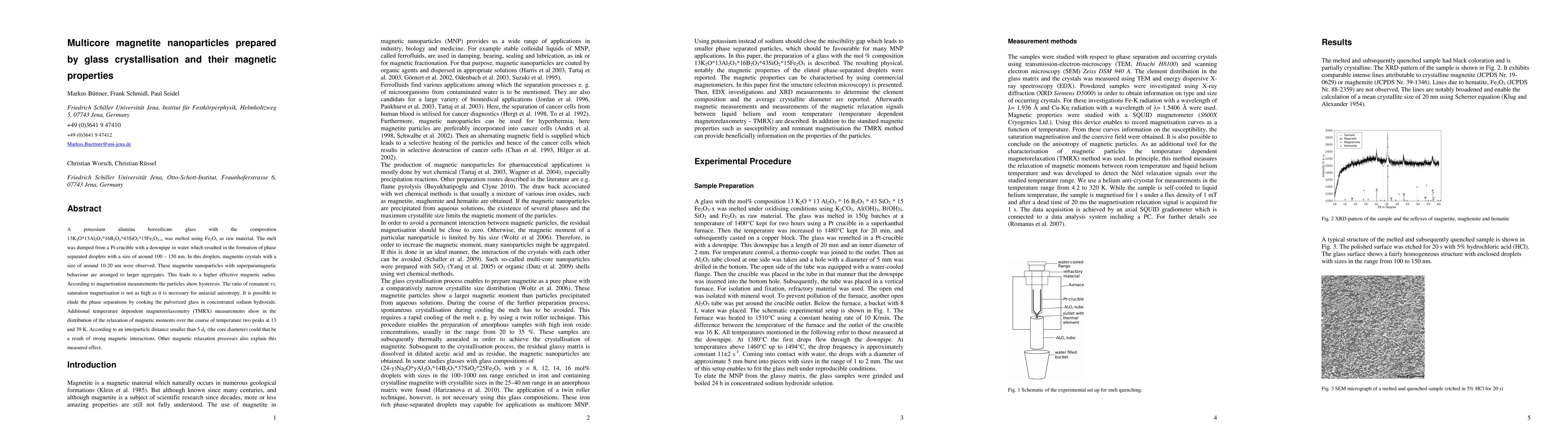 A potassium alumina borosilicate glass with the composition 13K2O*13Al2O3*16B2O3*43SiO2*15Fe2O3-x was melted using Fe2O3 as raw material. The melt was dumped from a Pt-crucible with a downpipe in water which resulted in the formation of phase separated droplets with a size of around 100 - 150 nm. In this droplets, magnetite crystals with a size of around 10-20 nm were observed. These magnetite nanoparticles with superparamagnetic behaviour are arranged to larger aggregates. This leads to a higher effective magnetic radius. According to magnetisation measurements the particles show hysteresis. The ratio of remanent vs. saturation magnetisation is not as high as it is necessary for uniaxial anisotropy. It is possible to elude the phase separations by cooking the pulverized glass in concentrated sodium hydroxide. Additional temperature dependent magnetorelaxometry (TMRX) measurements show in the distribution of the relaxation of magnetic moments over the course of temperature two peaks at 13 and 39 K. According to an interparticle distance smaller than 5 dC (the core diameter) could that be a result of strong magnetic interactions. Other magnetic relaxation processes also explain this measured effect.