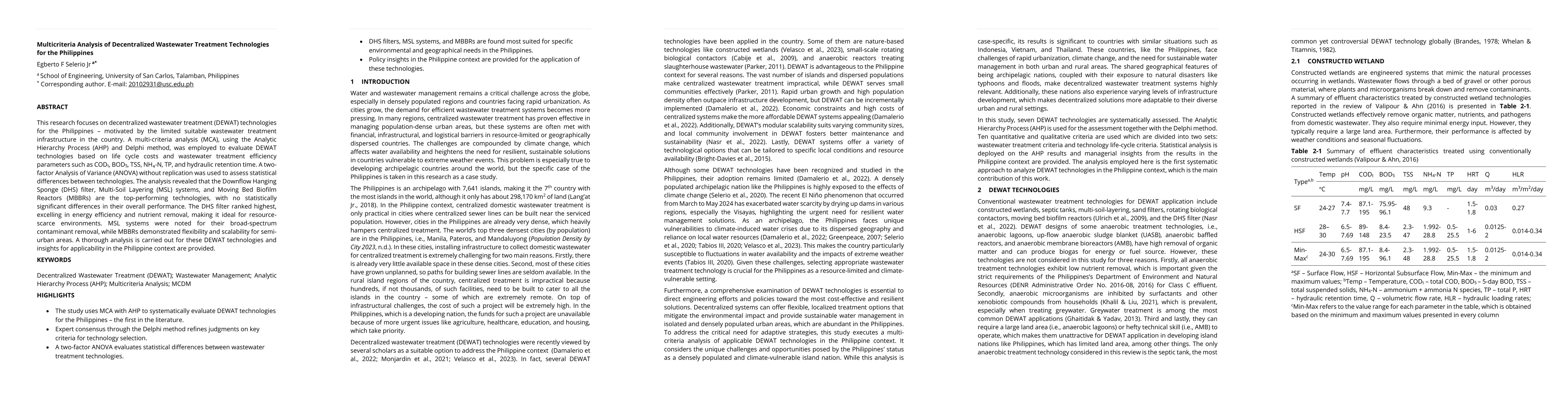 This study employs multi-criteria analysis to evaluate decentralized wastewater treatment technologies in the Philippines, revealing that the Downflow Hanging Sponge filter, Multi-Soil Layering systems, and Moving Bed Biofilm Reactors are top performers, each excelling in different parameters such as energy efficiency, contaminant removal, and scalability.