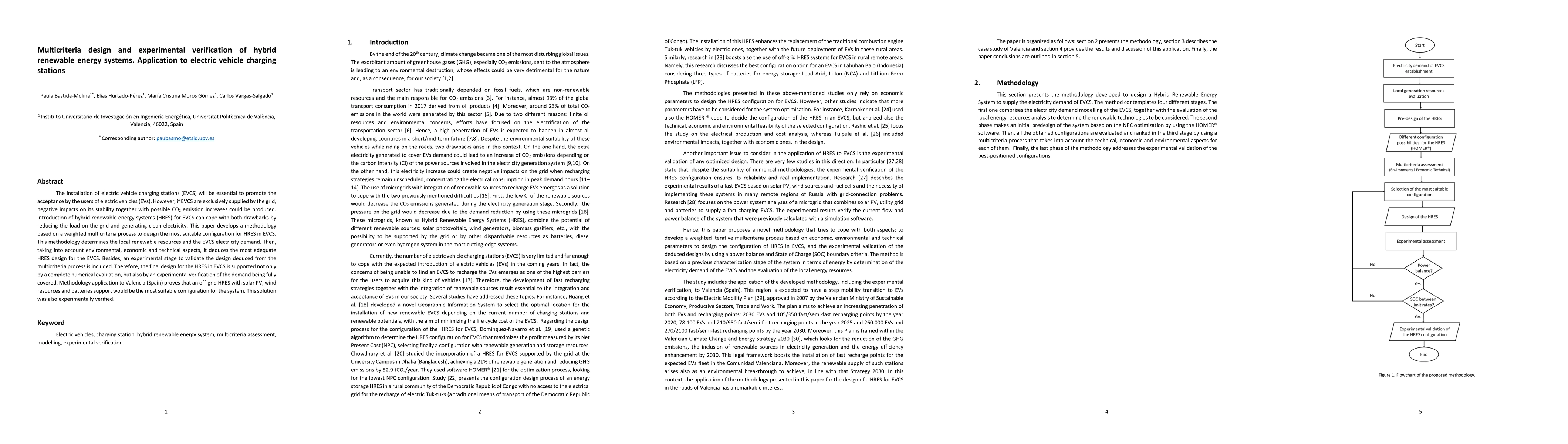 This paper proposes a multicriteria design methodology for hybrid renewable energy systems (HRES) to power electric vehicle charging stations (EVCS), aiming to reduce grid load and CO2 emissions. Experimental verification confirms the optimal HRES configuration for EVCS in Valencia, Spain, utilizing solar PV, wind, and battery storage.