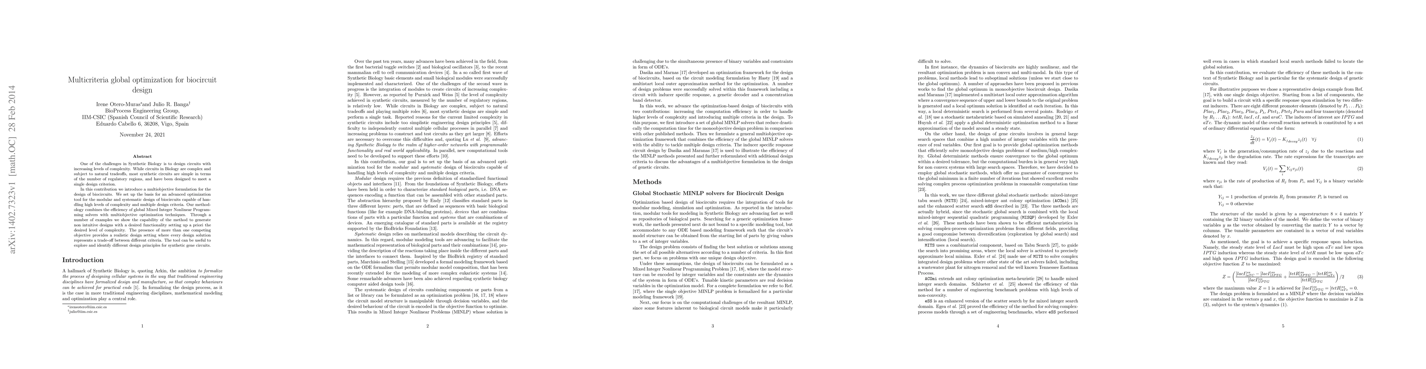 One of the challenges in Synthetic Biology is to design circuits with increasing levels of complexity. While circuits in Biology are complex and subject to natural tradeoffs, most synthetic circuits are simple in terms of the number of regulatory regions, and have been designed to meet a single design criterion. In this contribution we introduce a multiobjective formulation for the design of biocircuits. We set up the basis for an advanced optimization tool for the modular and systematic design of biocircuits capable of handling high levels of complexity and multiple design criteria. Our methodology combines the efficiency of global Mixed Integer Nonlinear Programming solvers with multiobjective optimization techniques. Through a number of examples we show the capability of the method to generate non intuitive designs with a desired functionality setting up a priori the desired level of complexity. The presence of more than one competing objective provides a realistic design setting where every design solution represents a trade-off between different criteria. The tool can be useful to explore and identify different design principles for synthetic gene circuits.