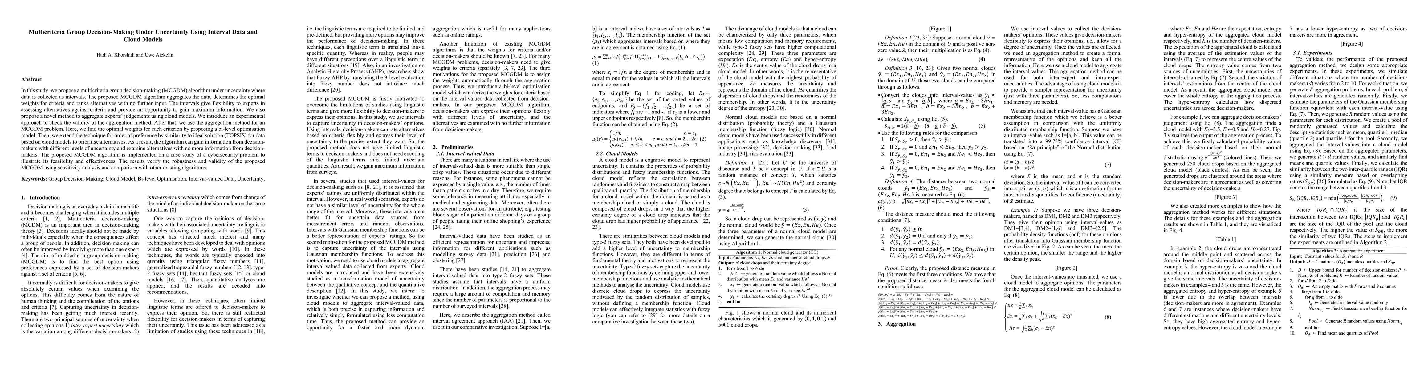 In this study, we propose a multicriteria group decision making (MCGDM) algorithm under uncertainty where data is collected as intervals. The proposed MCGDM algorithm aggregates the data, determines the optimal weights for criteria and ranks alternatives with no further input. The intervals give flexibility to experts in assessing alternatives against criteria and provide an opportunity to gain maximum information. We also propose a novel method to aggregate expert judgements using cloud models. We introduce an experimental approach to check the validity of the aggregation method. After that, we use the aggregation method for an MCGDM problem. Here, we find the optimal weights for each criterion by proposing a bilevel optimisation model. Then, we extend the technique for order of preference by similarity to ideal solution (TOPSIS) for data based on cloud models to prioritise alternatives. As a result, the algorithm can gain information from decision makers with different levels of uncertainty and examine alternatives with no more information from decision-makers. The proposed MCGDM algorithm is implemented on a case study of a cybersecurity problem to illustrate its feasibility and effectiveness. The results verify the robustness and validity of the proposed MCGDM using sensitivity analysis and comparison with other existing algorithms.