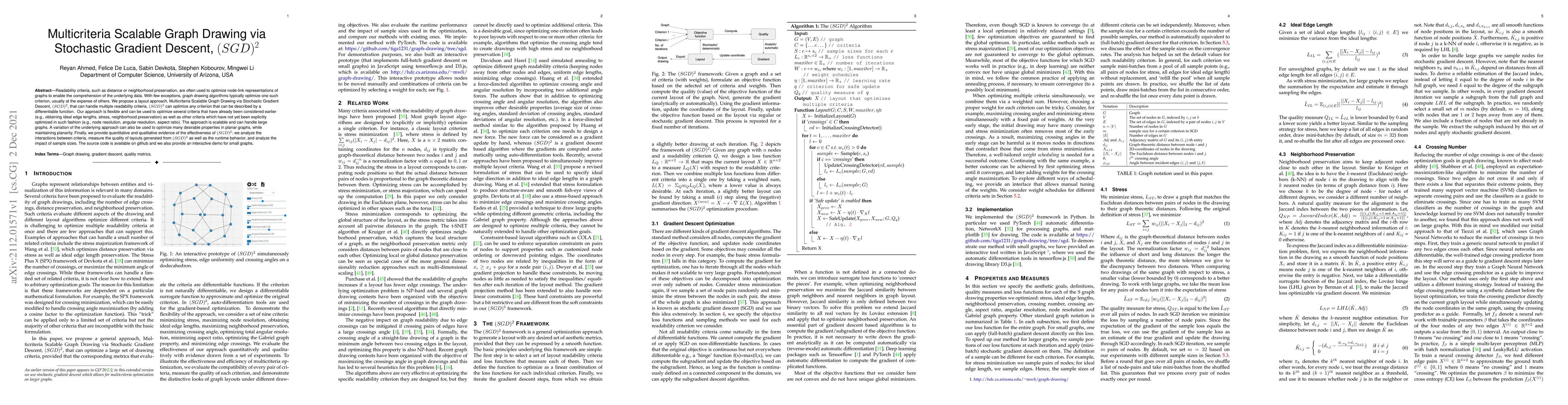 This paper introduces $(SGD)^2$, a scalable graph drawing method that optimizes multiple readability criteria using stochastic gradient descent. The approach can handle various criteria, including edge lengths and neighborhood preservation, and maintains planarity when necessary, demonstrating effectiveness through quantitative and qualitative analysis.