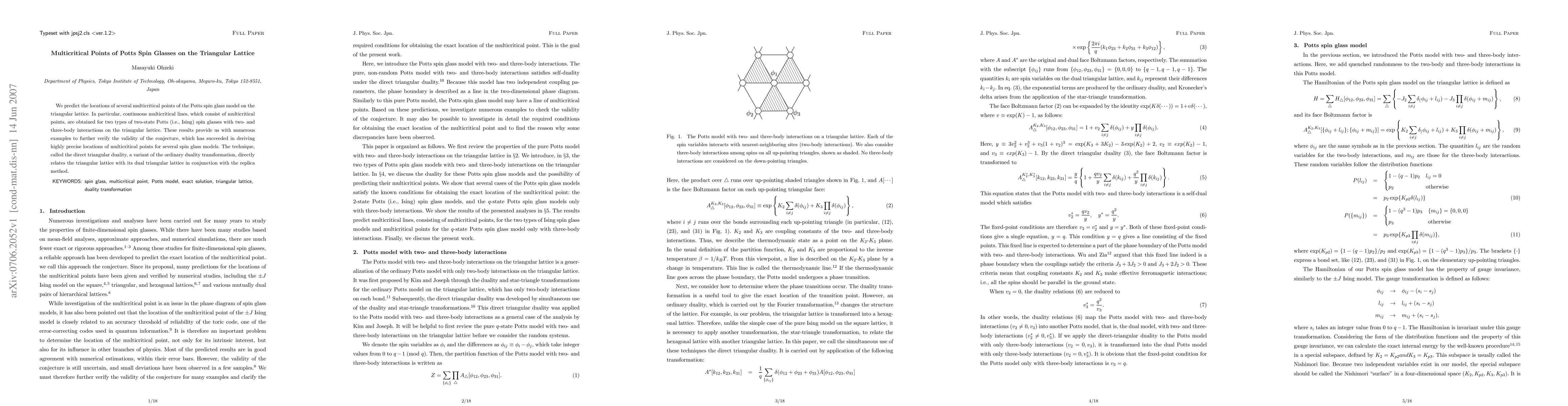 We predict the locations of several multicritical points of the Potts spin glass model on the triangular lattice. In particular, continuous multicritical lines, which consist of multicritical points, are obtained for two types of two-state Potts (i.e., Ising) spin glasses with two- and three-body interactions on the triangular lattice. These results provide us with numerous examples to further verify the validity of the conjecture, which has succeeded in deriving highly precise locations of multicritical points for several spin glass models. The technique, called the direct triangular duality, a variant of the ordinary duality transformation, directly relates the triangular lattice with its dual triangular lattice in conjunction with the replica method.