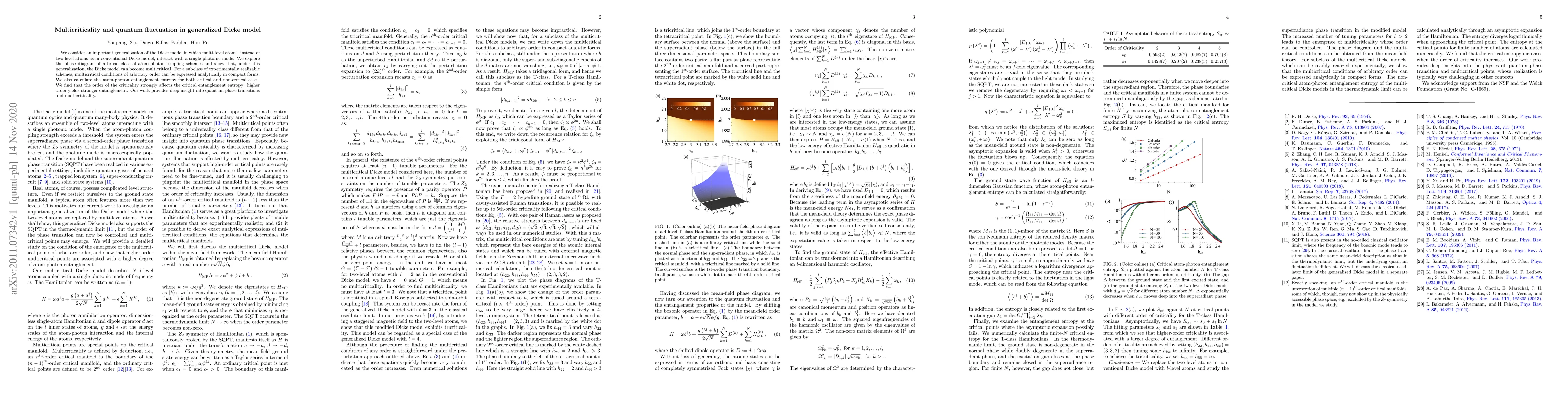 This paper generalizes the Dicke model to include multi-level atoms interacting with a photonic mode, revealing multicritical behavior and analytically expressible conditions for various coupling schemes. The study finds that higher order criticality correlates with stronger atom-photon entanglement entropy, offering significant insights into quantum phase transitions.