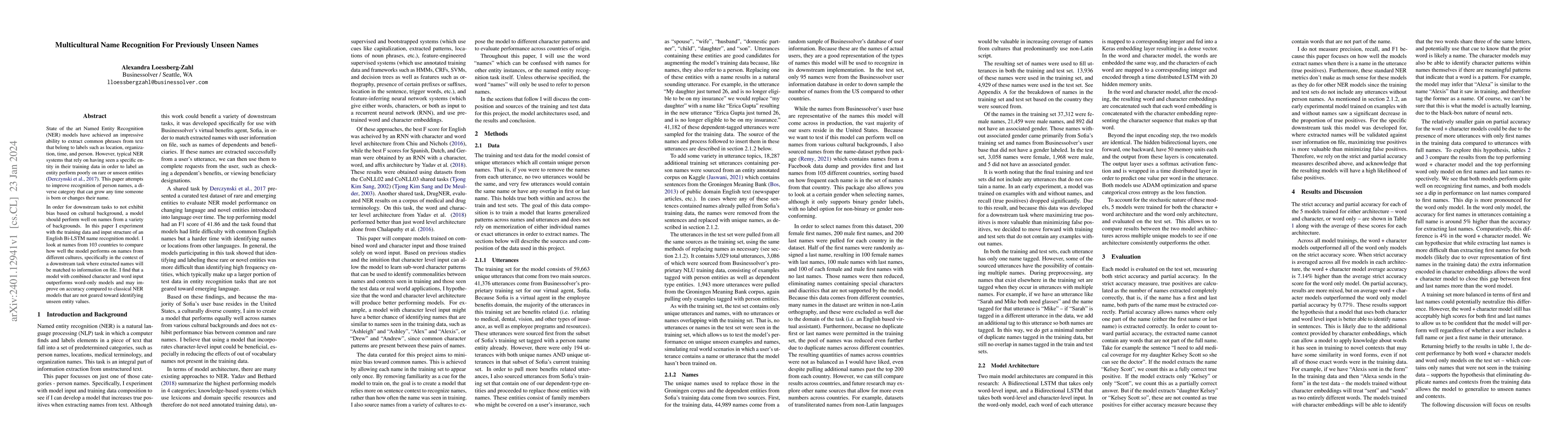 This paper explores enhancing Named Entity Recognition (NER) models for recognizing previously unseen person names from diverse cultural backgrounds. It finds that a Bi-LSTM model with combined character and word input outperforms traditional NER models, improving recognition accuracy for names from 103 countries.