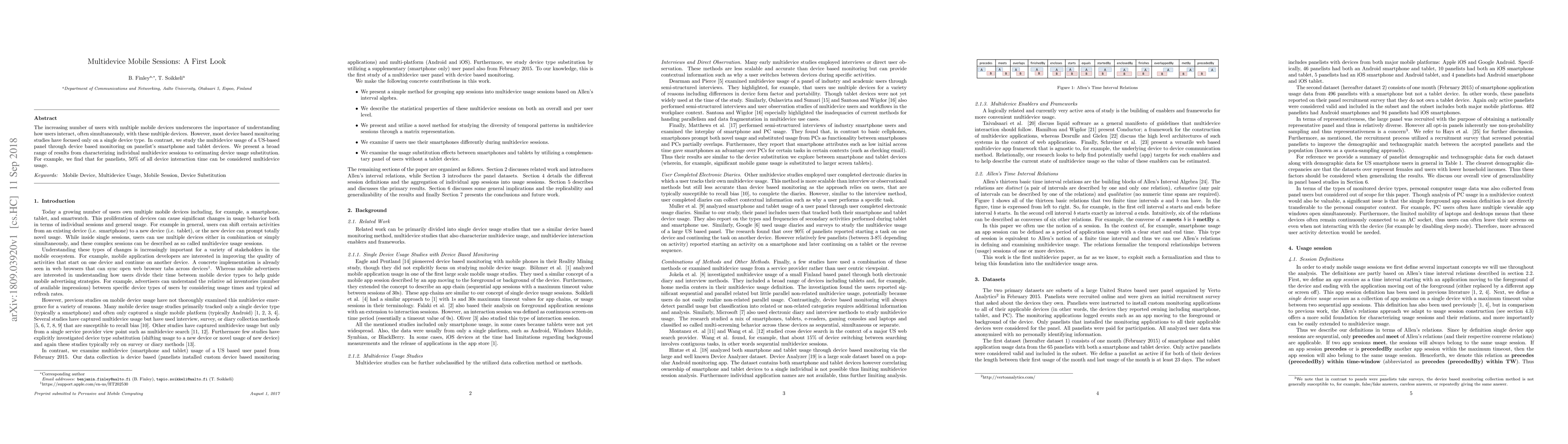 This study investigates how users interact with multiple mobile devices simultaneously, analyzing a US-based panel's smartphone and tablet usage through device monitoring. The research reveals that 50% of all device interaction time involves multidevice usage, highlighting the significance of understanding such interactions.