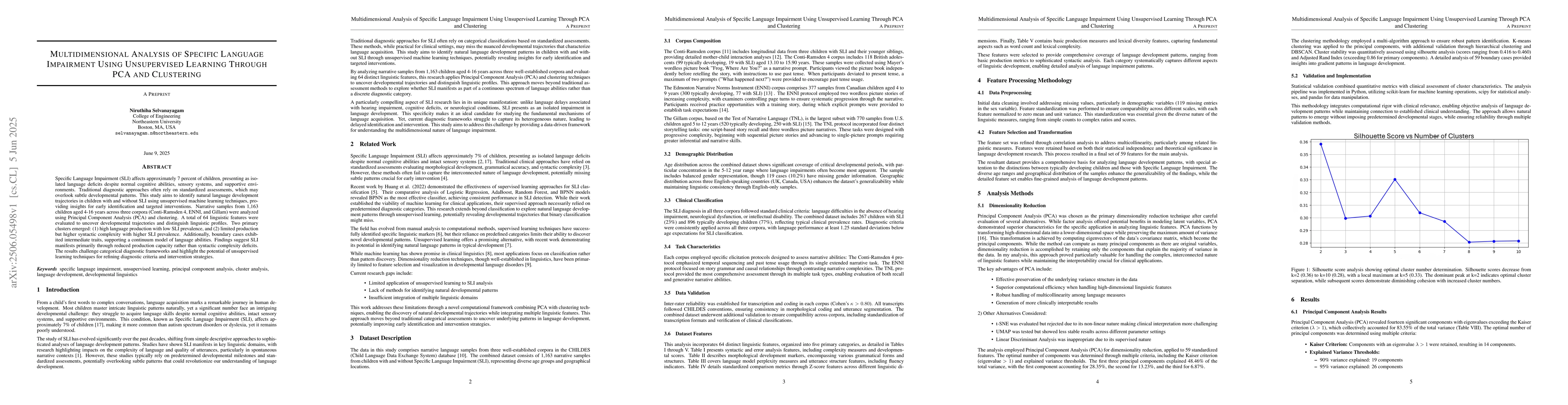 The application of PCA and clustering for multidimensional analysis of language features in children with and without SLI, revealing distinct linguistic profiles and challenging traditional diagnostic approaches.