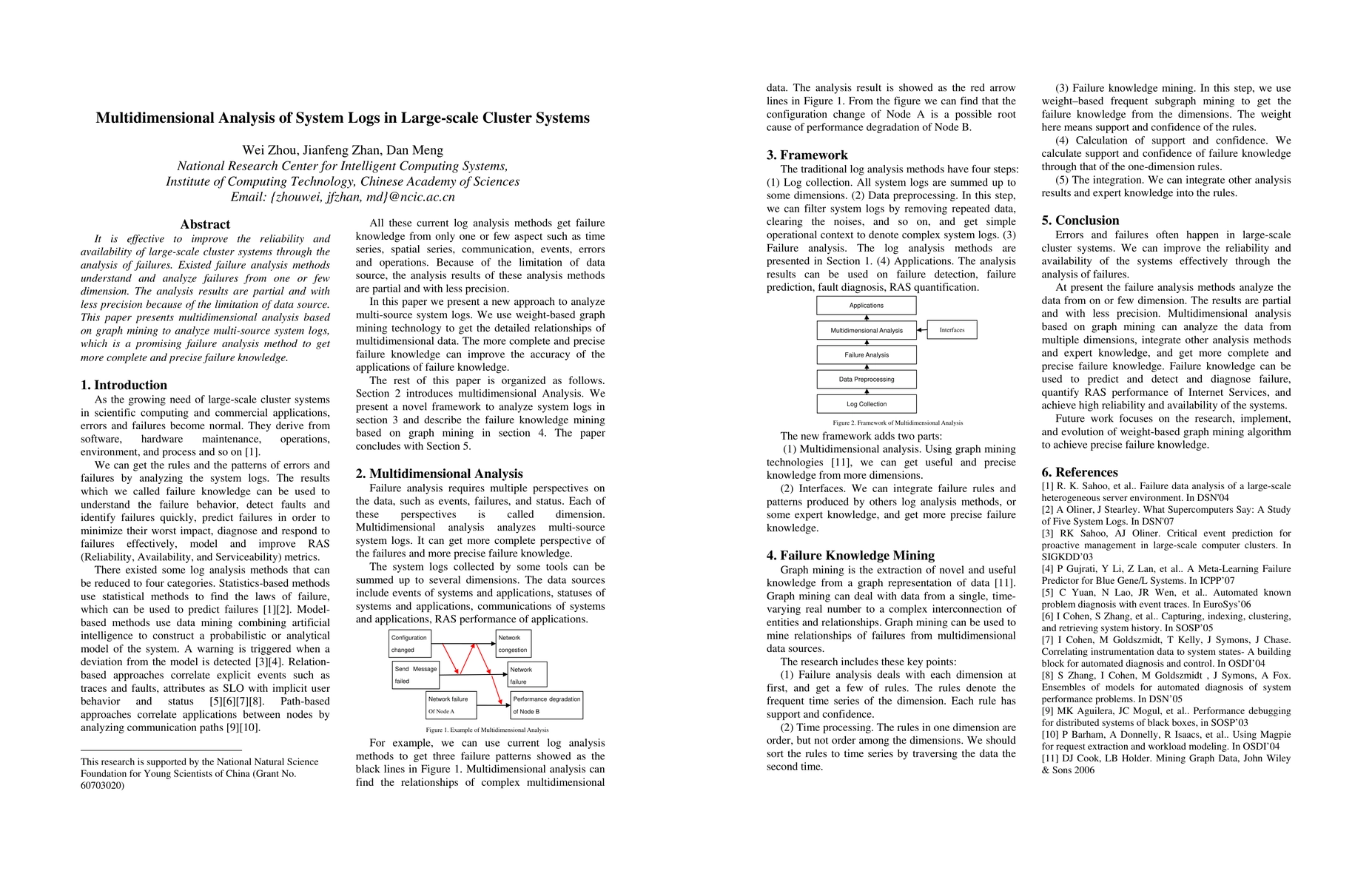 It is effective to improve the reliability and availability of large-scale cluster systems through the analysis of failures. Existed failure analysis methods understand and analyze failures from one or few dimension. The analysis results are partial and with less precision because of the limitation of data source. This paper presents multidimensional analysis based on graph mining to analyze multi-source system logs, which is a promising failure analysis method to get more complete and precise failure knowledge.
