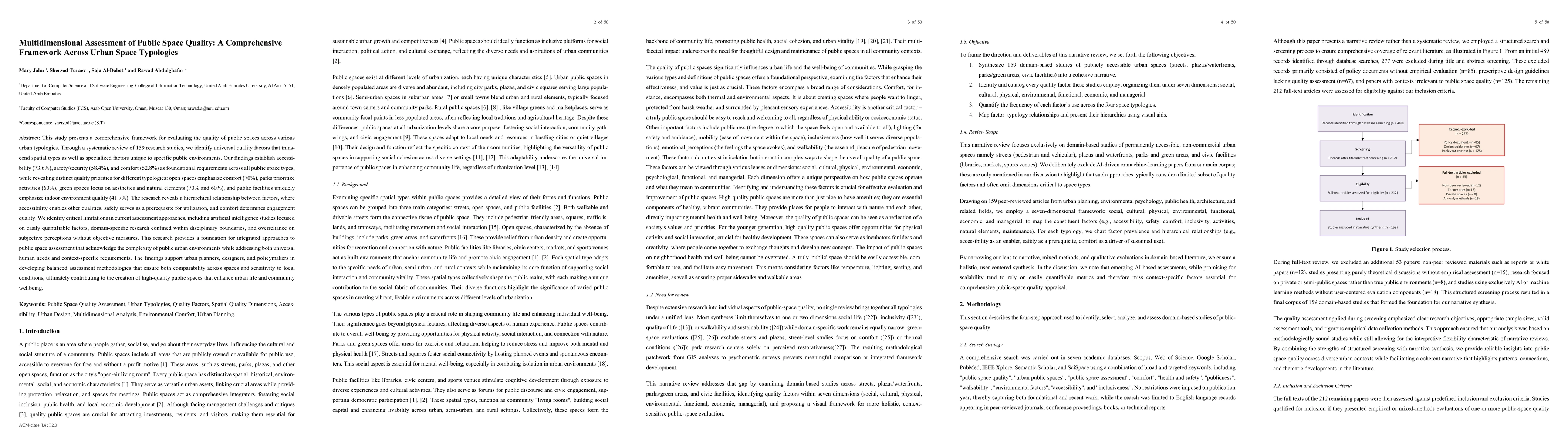 A systematic review of 159 research studies was conducted to identify universal and specialized quality factors for public spaces across urban typologies.