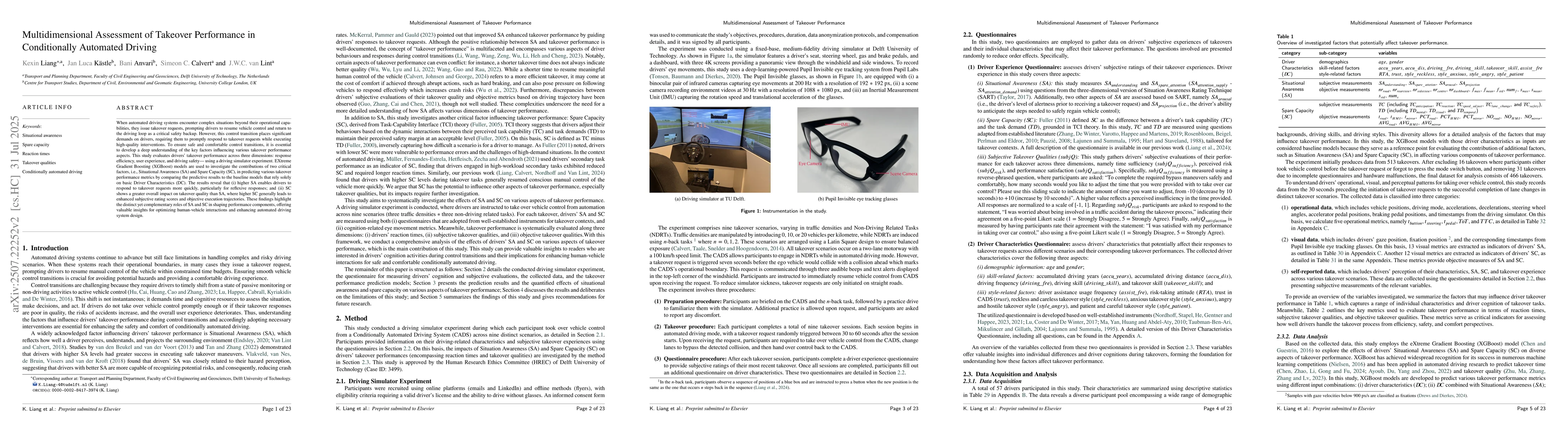 This study uses a driving simulator to assess drivers' takeover performance in automated vehicles, focusing on response efficiency, user experience, and driving safety. It finds that Situational Awareness helps drivers respond faster, especially reflexively, while Spare Capacity has a greater impact on takeover quality, improving both subjective ratings and objective trajectories. The research highlights the unique yet complementary roles of these factors in optimizing human-vehicle interactions and automated driving system design.