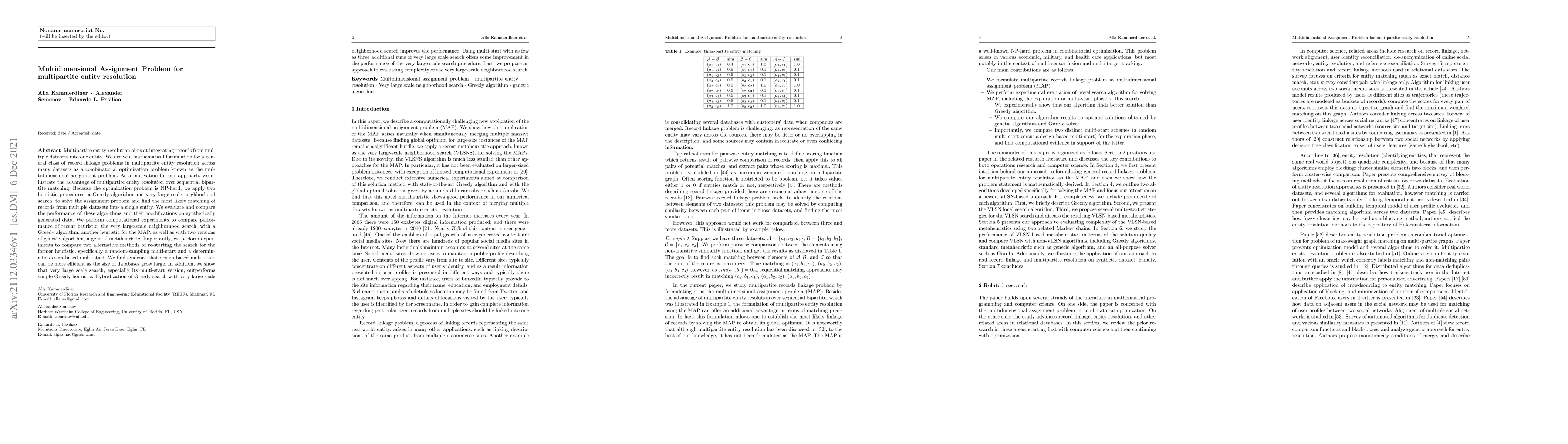 This paper formulates multipartite entity resolution as a multidimensional assignment problem and proposes heuristics, including a Greedy algorithm and very large scale neighborhood search, to solve it. Experiments show that the very large scale neighborhood search with a design-based multi-start approach outperforms the Greedy heuristic, especially for large datasets, and hybrid methods further improve performance.