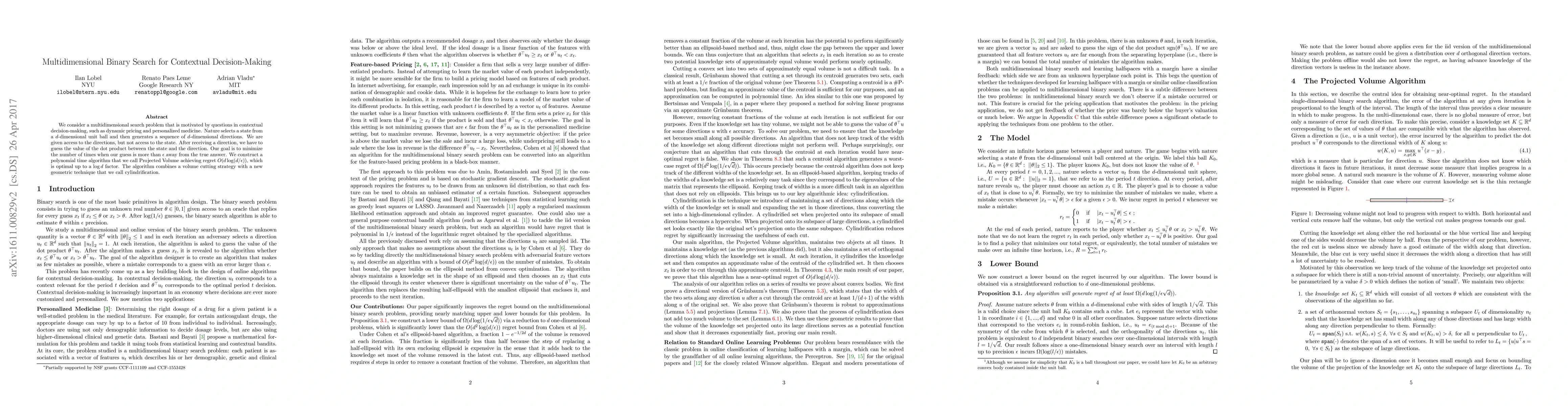We consider a multidimensional search problem that is motivated by questions in contextual decision-making, such as dynamic pricing and personalized medicine. Nature selects a state from a $d$-dimensional unit ball and then generates a sequence of $d$-dimensional directions. We are given access to the directions, but not access to the state. After receiving a direction, we have to guess the value of the dot product between the state and the direction. Our goal is to minimize the number of times when our guess is more than $\epsilon$ away from the true answer. We construct a polynomial time algorithm that we call Projected Volume achieving regret $O(d\log(d/\epsilon))$, which is optimal up to a $\log d$ factor. The algorithm combines a volume cutting strategy with a new geometric technique that we call cylindrification.