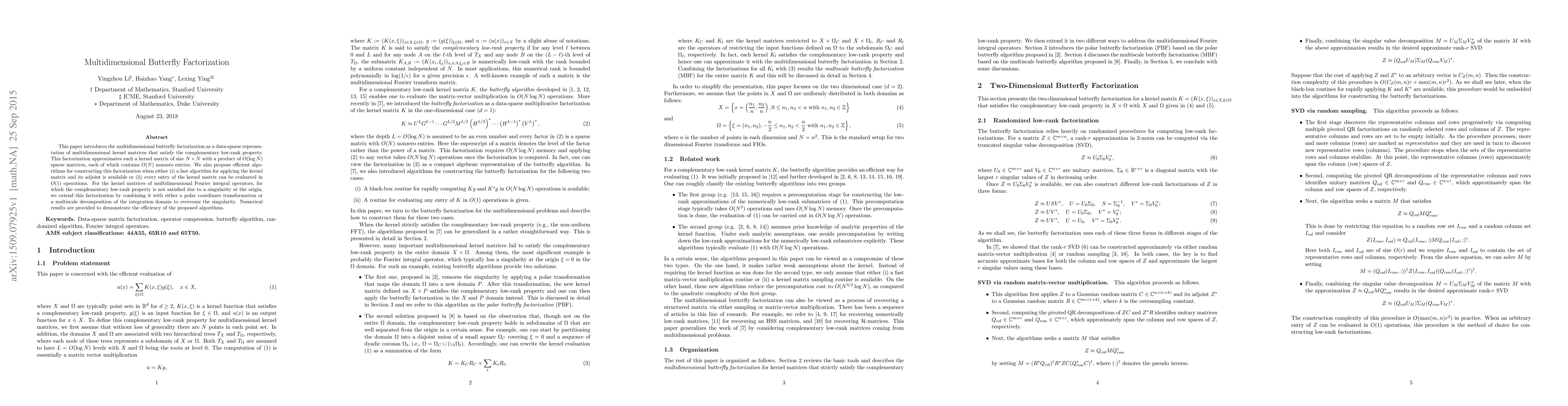 This paper introduces a multidimensional butterfly factorization to efficiently represent large kernel matrices using sparse matrices, leveraging complementary low-rank properties. It proposes algorithms for constructing this factorization and extends it to handle singularities in Fourier integral operators through transformations or decompositions.