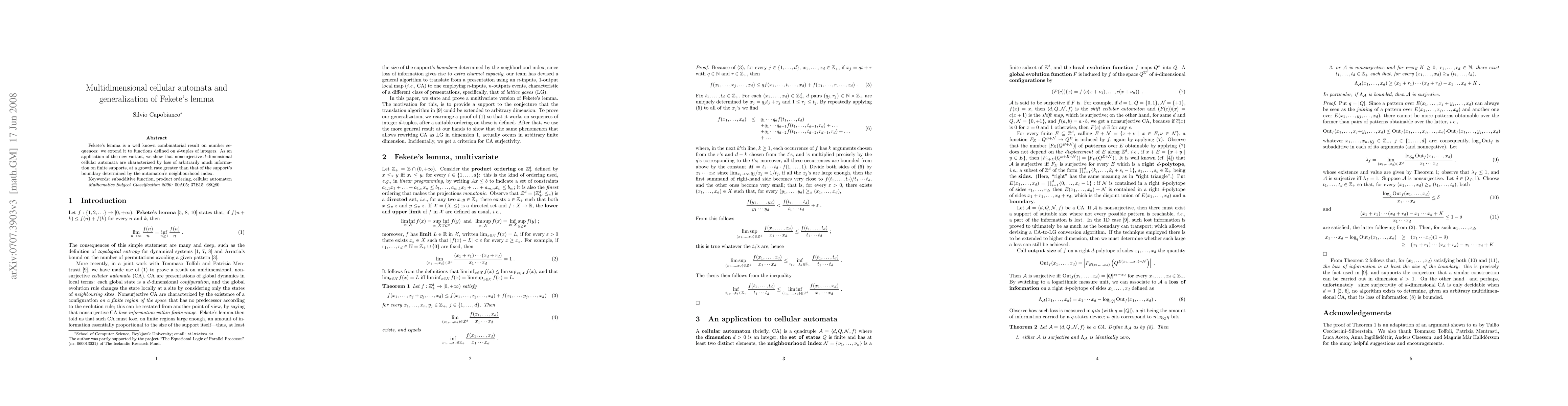 This paper extends Fekete's lemma to functions on d-tuples of integers, showing that nonsurjective d-dimensional cellular automata lose information at a growth rate greater than the support's boundary.