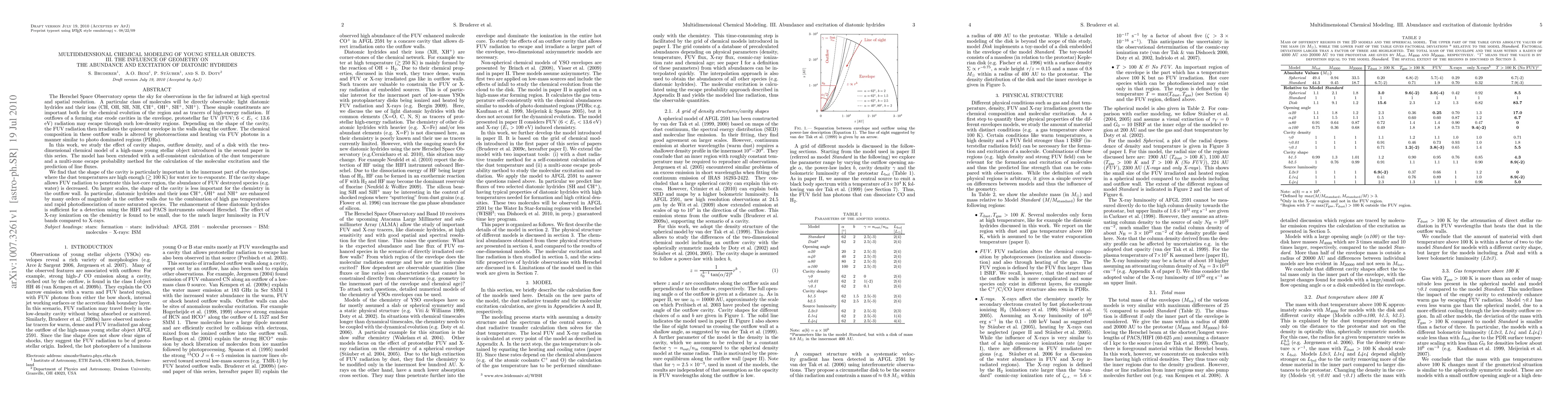The Herschel Space Observatory opens the sky for observations in the far infrared at high spectral and spatial resolution. A particular class of molecules will be directly observable; light diatomic hydrides and their ions (CH, OH, SH, NH, CH+, OH+, SH+, NH+). These simple constituents are important both for the chemical evolution of the region and as tracers of high-energy radiation. If outflows of a forming star erode cavities in the envelope, protostellar far UV (FUV; 6 < E_gamma < 13.6 eV) radiation may escape through such low-density regions. Depending on the shape of the cavity, the FUV radiation then irradiates the quiescent envelope in the walls along the outflow. The chemical composition in these outflow walls is altered by photoreactions and heating via FUV photons in a manner similar to photo dominated regions (PDRs). In this work, we study the effect of cavity shapes, outflow density, and of a disk with the two-dimensional chemical model of a high-mass young stellar object introduced in the second paper in this series. We find that the shape of the cavity is particularly important in the innermost part of the envelope, where the dust temperatures are high enough (> 100 K) for water ice to evaporate. If the cavity shape allows FUV radiation to penetrate this hot-core region, the abundance of FUV destroyed species (e.g. water) is decreased. In particular, diatomic hydrides and their ions CH$+, OH+ and NH+ are enhanced by many orders of magnitude in the outflow walls due to the combination of high gas temperatures and rapid photodissociation of more saturated species. The enhancement of these diatomic hydrides is sufficient for a detection using the HIFI and PACS instruments onboard Herschel. The effect of X-ray ionization on the chemistry is found to be small, due to the much larger luminosity in FUV bands compared to X-rays.